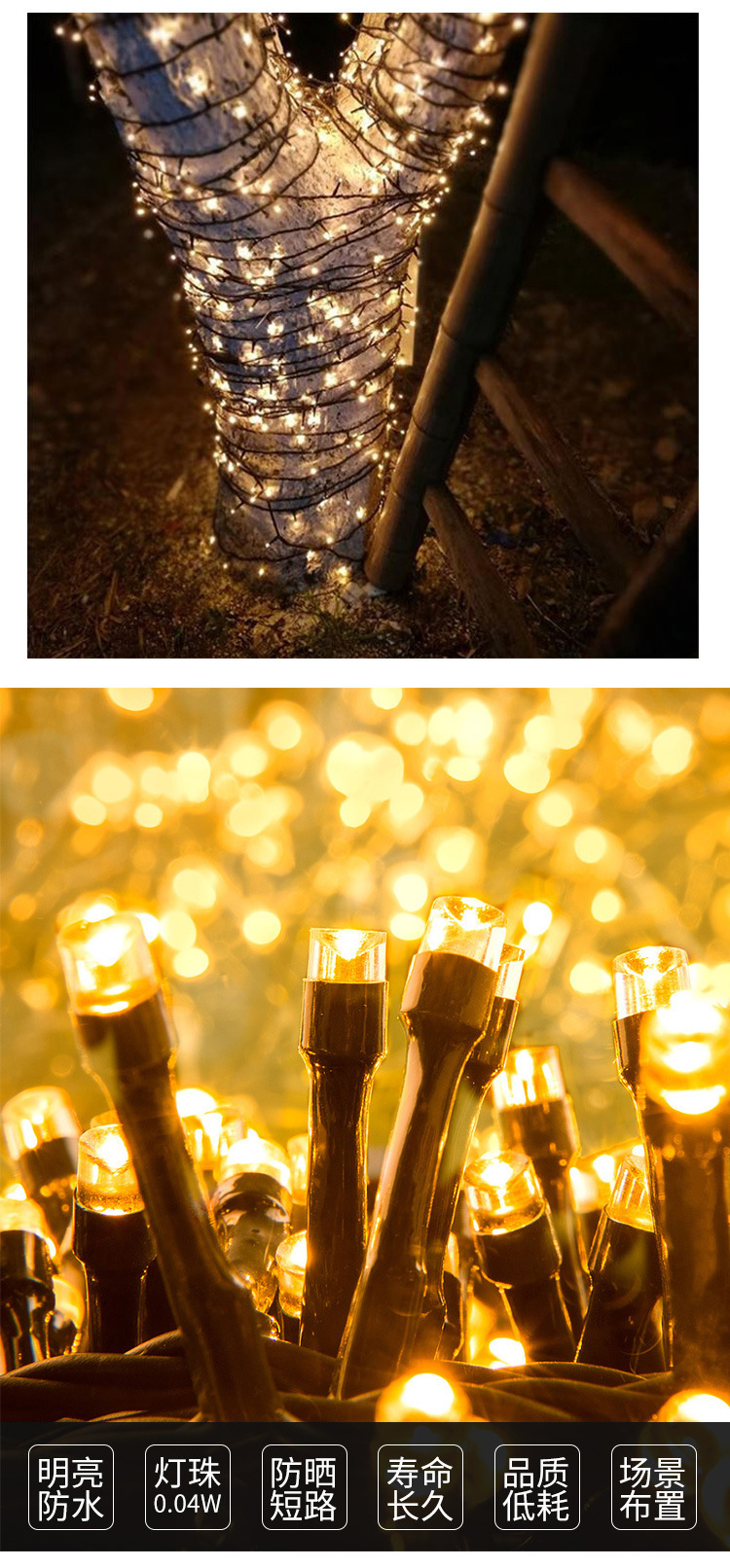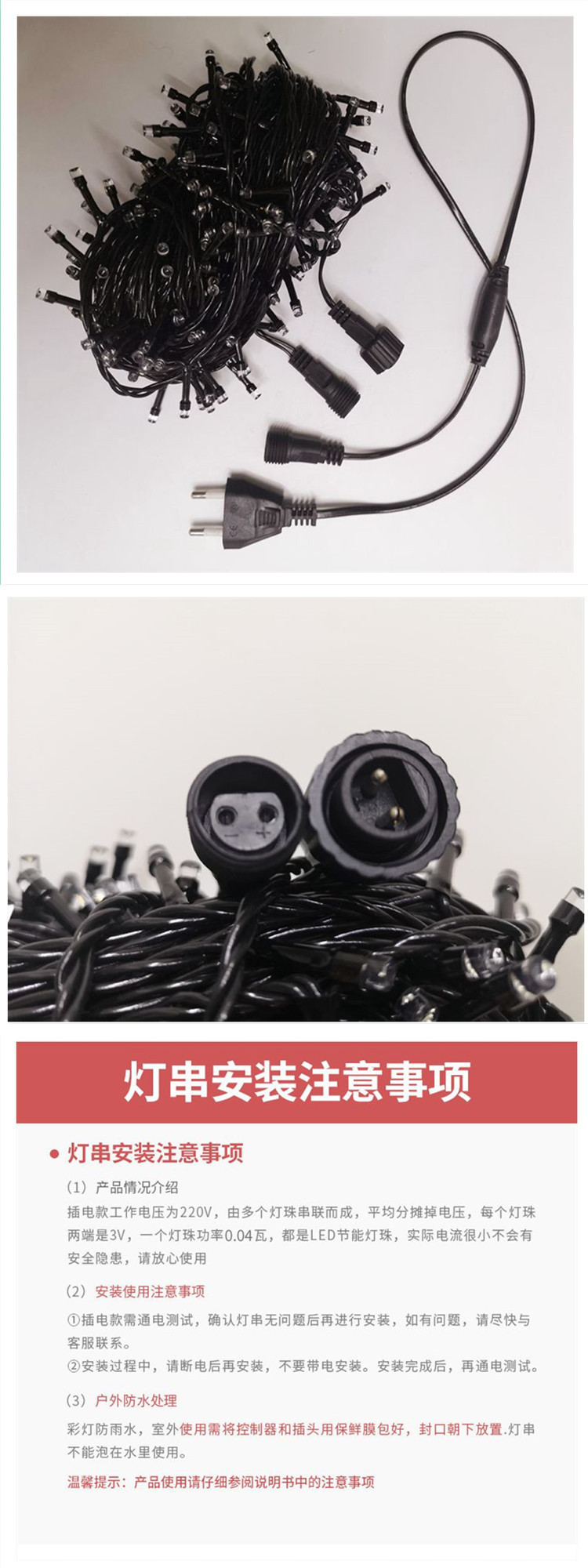 | Especificaciones | 20 metros, 200 luces, cable negro con cadena de luces de burbujas intermitentes.,20 metros, 156 luces, cable negro con tira de luces de burbujas intermitentes.,10 metros, 100 luces, cable negro, guirnalda de luces con luz fija.,Cadena de luces de alambre negro de 10 metros y 100 luces con bombilla flash,Enchufe impermeable macho y hembra. |