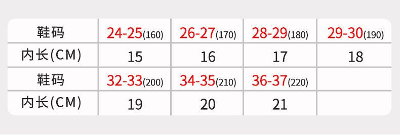 | Tamaño | Tamaño 24-25 (160) longitud interior 15cm adecuado para 2-3 años,Tamaño 26-27 (170) longitud interior 16cm adecuado para 3-4 años,Tamaño 28-29 (180) longitud interior 17cm adecuado para 4-5 años,Tamaño 30-31 (190) longitud interior 18cm adecuado para 5-6 años,32-33 tamaño (200) longitud interior 19CM adecuado para 6-7 años de edad,Tamaño 34-35 (210) longitud interior 20cm adecuado para 7-8 años,36-37 tamaño (220) longitud interior 21CM adecuado para 9-10 años de edad |