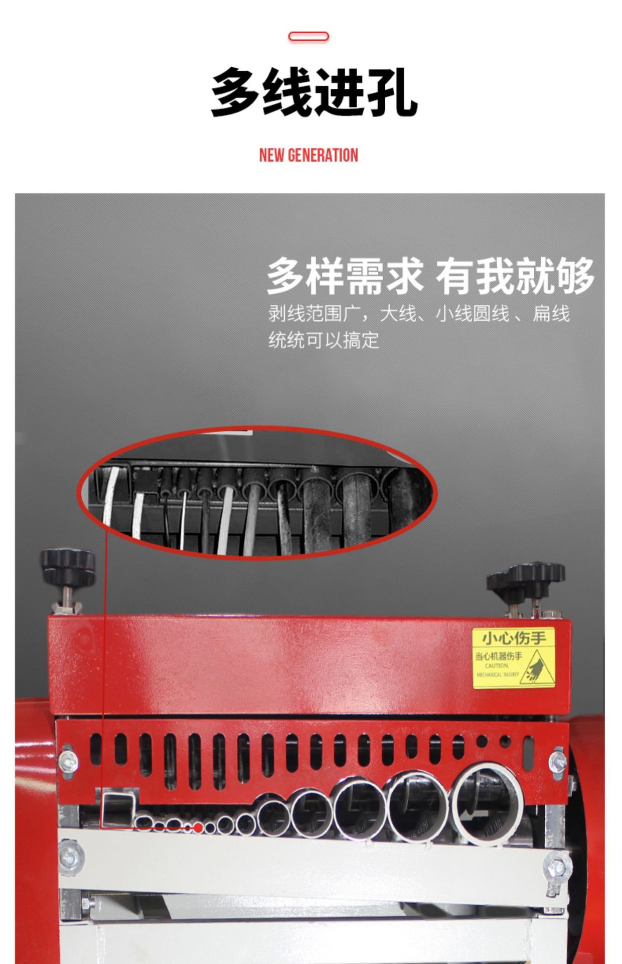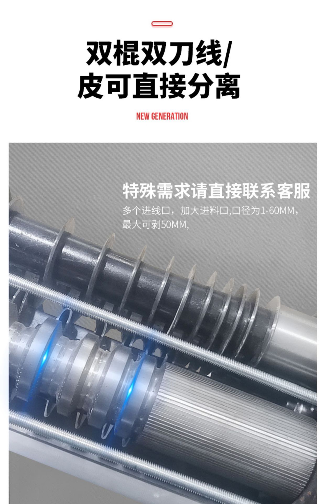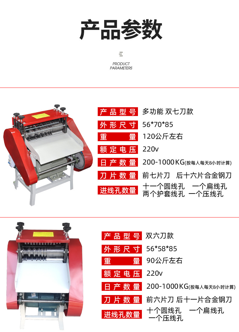 | Especificaciones y modelos | A1实惠款单刀不带电机1-40mm 整机质保三年,A1实惠款单刀带1.5千瓦电机 整机质保三年,A1实惠款单刀带2.2千瓦电机 整机质保三年,A2新款单刀1-45mm不带电机 整机质保三年,A2新款单刀带1.5千瓦电机 整机质保三年,A2新款单刀带2.2千瓦电机 整机质保三年,A2新款单刀带3.0千瓦电机 整机质保三年,C1经济款双三刀1-45mm不带电机 整机质保三年,C1经济款双三刀带1.5千瓦电机 整机质保三年,C1经济款双三刀带2.2千瓦电机 整机质保三年,C1经济款双三刀带3.0千瓦电机 整机质保三年,C2实惠款双五刀不带电机1-45mm 整机质保三年,C2实惠款双五刀带1.5千瓦电机 整机质保三年,C2实惠款双五刀带2.2千瓦电机 整机质保三年,C2实惠款双五刀带3千瓦电机 整机质保三年,C3新款双六刀不带电机1-45mm 整机质保三年,C3新款双六刀带1.5千瓦电机 整机质保三年,C3新款双六刀带2.2千瓦电机 整机质保三年,C3新款双六刀带3千瓦电机 整机质保三年,C4出口款双六刀不带电机1-45mm 整机质保三年,C4出口款双六刀带1.5千瓦电机 整机质保三年,C4出口款双六刀带2.2千瓦电机 整机质保三年,C4出口款双六刀带3千瓦电机 整机质保三年,F1新款多功能双七刀不带电机1-60mm 整机质保三年,F1新款多功能双七刀带3千瓦电机220v 整机质保三年,F1新款多功能双七刀带3千瓦电机380v 整机质保三年,F1新款多功能双七刀带4千瓦电机220v 整机质保三年,F2新款多功能双八刀不带电机1-65mm 整机质保三年,F2新款多功能双八刀带3千瓦电机380v 整机质保三年,F2新款多功能双八刀带3千瓦电机220v 整机质保三年,F2新款多功能双八刀带4千瓦电机220v 整机质保三年,F3新款多功能双九刀不带电机1-70mm,F3新款多功能双九刀带3千瓦电机(220V),F3新款多功能双九刀带3千瓦电机(380V),F3新款多功能双九刀带4千瓦电机(220V),F5工业款剥线机带3千瓦电机(220v) 整机质保三年,F5工业款剥线机带3千瓦电机(380v) 整机质保三年,老款单刀不带电机 不送配件 |