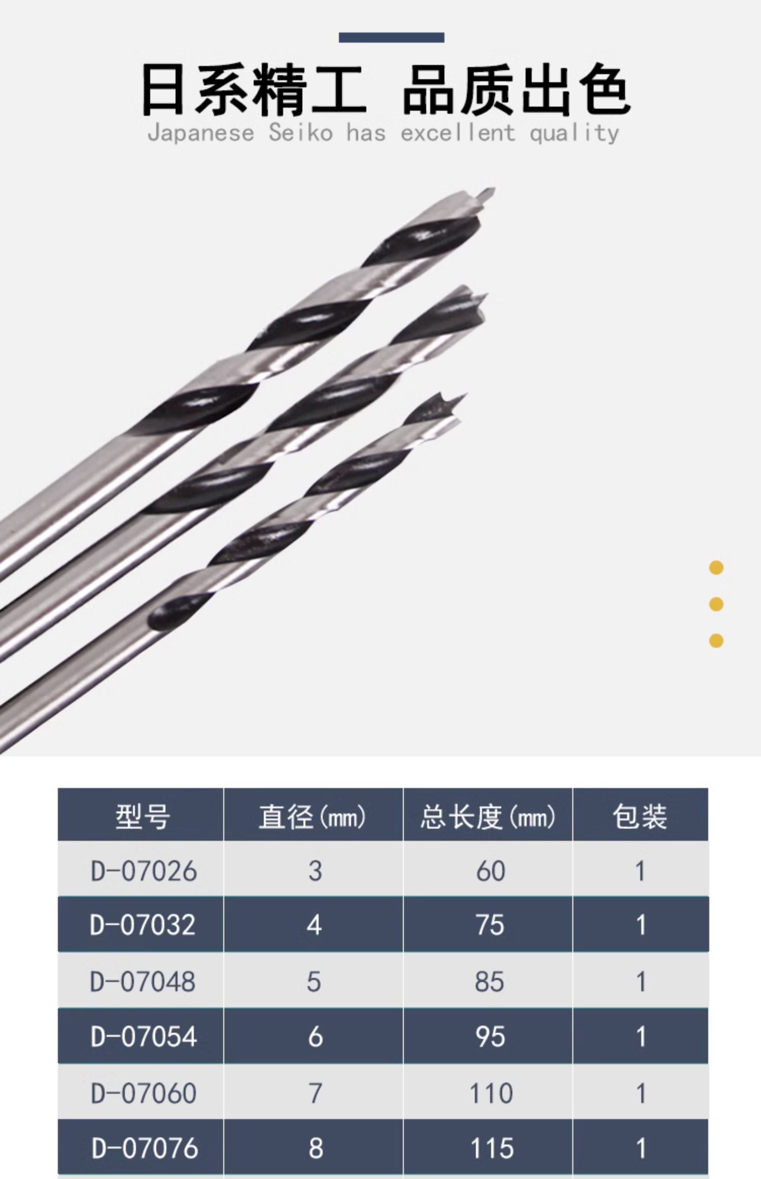 | Especificaciones y modelos | D-07026,钻头直径3mm,全长60mm,柄径3mm(圆柄),单支装 D-07026,D-07032,钻头直径4mm,全长75mm,柄径4mm(圆柄),单支装 D-07032,D-07048,钻头直径5mm,全长85mm,柄径5mm(圆柄),单支装 D-07048,D-07054,钻头直径6mm,全长95mm,柄径6mm(圆柄),单支装 D-07054,D-07060,钻头直径7mm,全长110mm,柄径7mm(圆柄),单支装 D-07060,D-07076,钻头直径8mm,全长155mm,柄径8mm(圆柄),单支装 D-07076,D-07082,钻头直径9mm,全长125mm,柄径9mm(圆柄),单支装 D-07082,D-07098,钻头直径10mm,全长135mm,柄径10mm(圆柄),单支装 D-07098,D-07107,钻头直径12mm,全长155mm,柄径10mm(圆柄),单支装 D-07107,D-07113,钻头直径14mm,全长170mm,柄径10mm(圆柄),单支装 D-07113,D-07129,钻头直径16mm,全长180mm,柄径10mm(圆柄),单支装 D-07129,D-07135,钻头直径18mm,全长180mm,柄径10mm(圆柄),单支装 D-07135,D-07141,钻头直径20mm,全长200mm,柄径10mm(圆柄),单支装 D-07141,D-07157,钻头直径6mm,全长315mm,柄径6mm(圆柄),单支装 D-07157,D-07163,钻头直径8mm,全长315mm,柄径8mm(圆柄),单支装 D-07163,D-07179,钻头直径10mm,全长315mm,柄径10mm(圆柄),单支装 D-07179,D-07185,钻头直径12mm,全长315mm,柄径10mm(圆柄),单支装 D-07185,D-07191,钻头直径14mm,全长315mm,柄径10mm(圆柄),单支装 D-07191,D-07200,钻头直径16mm,全长315mm,柄径10mm(圆柄),单支装 D-07200,D-07216,钻头直径18mm,全长335mm,柄径10mm(圆柄),单支装 D-07216,D-07222,钻头直径20mm,全长335mm,柄径10mm(圆柄),单支装 D-07222 |
