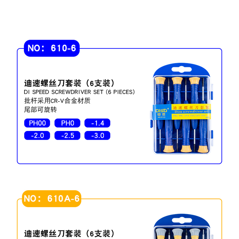 | Color | Conjunto de destornillador de mango azul (610 - 6), conjunto de destornillador de mango azul (610a - 6), destornillador de mango azul (cross ph00), destornillador de mango azul (610a - 6), destornillador de mango azul (610a - 6), destornillador de mango azul (cross ph0), destornillador de mango azul (palabra 1.4), destornillador de mango azul (palabra 2.0), destornillador de mango azul (palabra 2.5), destornillador de Mango azul (palabra 3.0), destornillador de mango azul (palabra 1.5) |