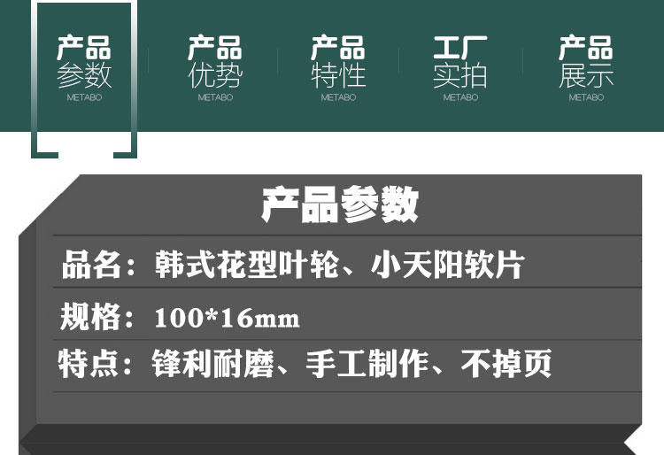 | Especificaciones | 80 ¿ de arena negra de película blanda de alta calidad, 120 ¿ de arena negra de película blanda de alta calidad, 240 ¿ de arena negra de película blanda de alta calidad, 320 ¿ de arena negra de película blanda de alta calidad, 80 ¿ de impulsor de flores coreanas de película blanda de arena azul, 120 ¿ de impulsor de flores coreanas de película blanda de arena azul, 240 de película blanda de arena azul, 320 de impulsor de flores coreanas de película blanda de arena azul |