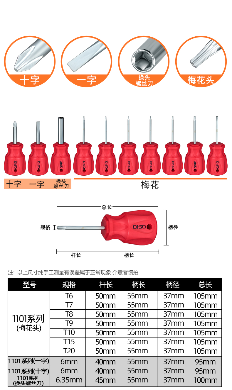 | Colores | 2-6*25mm cabeza de zanahoria juego hexagonal (1101),2-6*50mm cabeza de zanahoria juego hexagonal (1101),T6 cabeza de rábano ciruela (1101),T7 cabeza de rábano ciruela (1101),T8 cabeza de rábano ciruela (1101),T9 cabeza de rábano ciruela (1101),T10 cabeza de rábano ciruela (1101),T15 cabeza de rábano ciruela (1101),T20 cabeza de rábano ciruela (1101),Destornillador de cabeza de rábano cruzado de 6mm (1101),Destornillador de cabeza de rábano de una palabra de 6mm (1101),Destornillador de cabeza de rábano (1101),Juego de flor de ciruelo con cabeza de rábano T7-T20 (1101),2*25 cabeza de rábano hexagonal (1101),2.5*25 cabeza de rábano hexagonal (1101),3*25 cabeza de rábano hexagonal (1101),4*25 cabeza de rábano hexagonal (1101),5*25 cabeza de rábano hexagonal (1101),6*25 cabeza de rábano hexagonal (1101),2*50 cabeza de rábano hexagonal (1101),2.5*50 cabeza de rábano hexagonal (1101),3*50 cabeza de rábano hexagonal (1101),4*50 cabeza de rábano hexagonal (1101),5*50 cabeza de rábano hexagonal (1101),6*50 cabeza de rábano hexagonal (1101) |