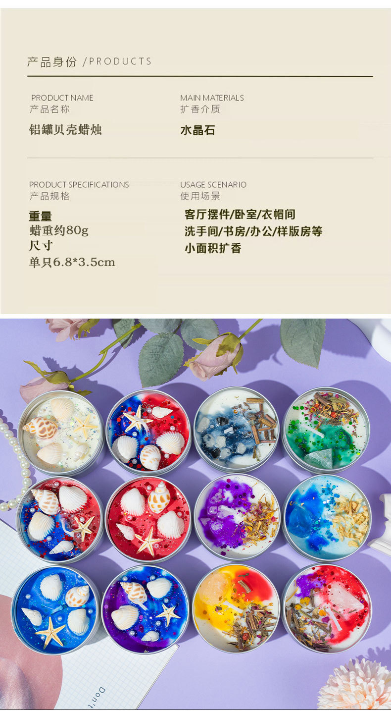 | Tamaño | Caja de aluminio azul de flores secas [cedro de vainilla], caja de aluminio rojo y morado de flores secas [lavanda], caja de aluminio azul de flores secas [brisa marina de limón], caja de aluminio púrpura de flores secas [roland de coco], caja de aluminio verde de flores secas [uva de vainilla], caja de aluminio amarillo de flores secas [cítricos de limón], caja de aluminio Rojo y azul de conchas [rosa], caja de aluminio azul de conchas [osmanthus], caja de aluminio rojo de conchas [campana de viento azul], caja de aluminio blanco de conchas [coco], caja de aluminio azul y morado de conchas [océano], pequeña linterna de flores secas al azar. |