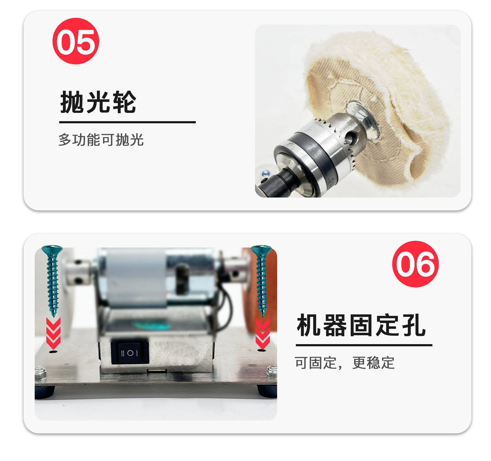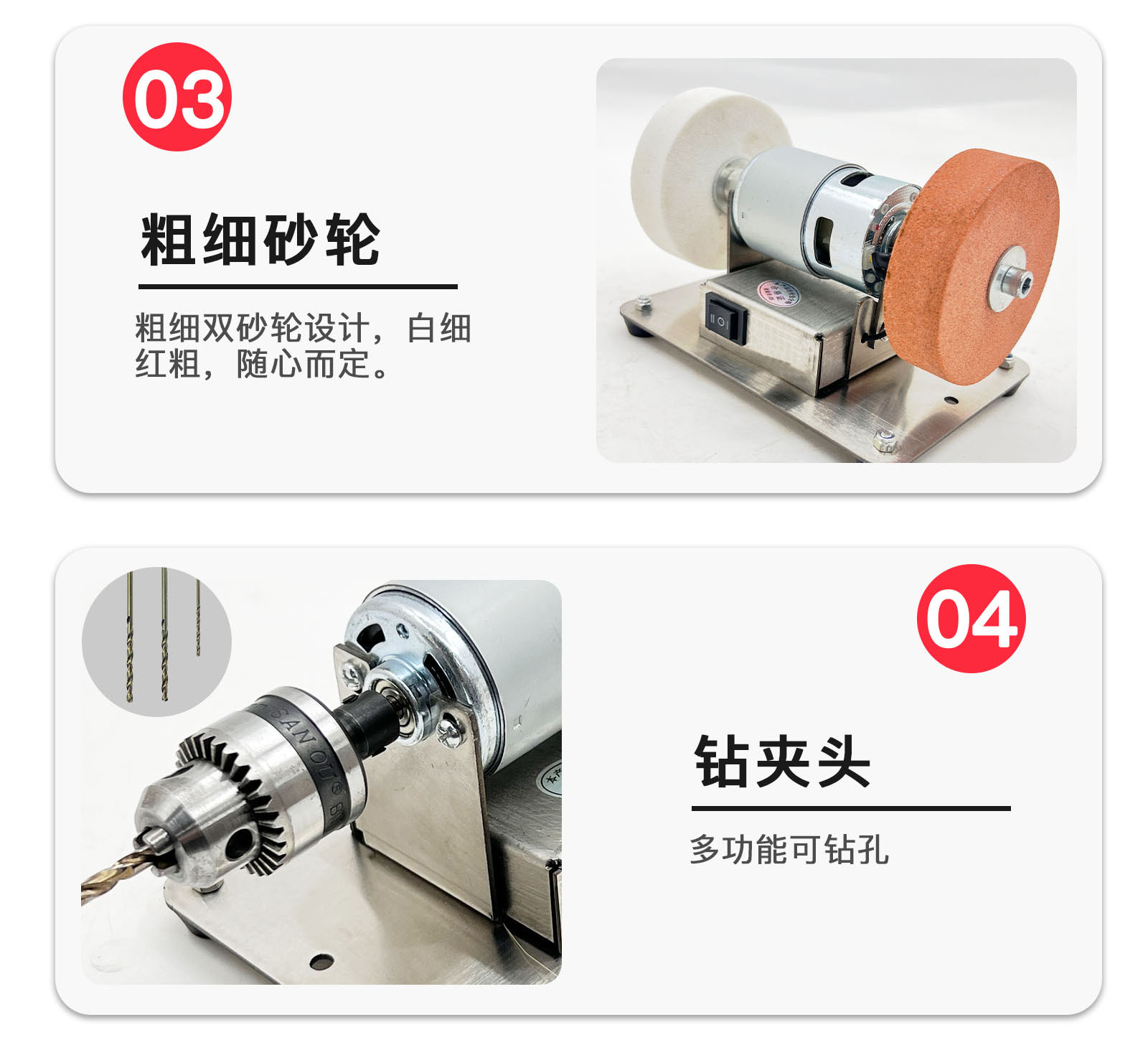 Pequeña turbina de arena (dos tipos de ruedas de molienda gruesas y finas), pequeña turbina de arena + taladro, pequeña turbina de arena + taladro + pulido