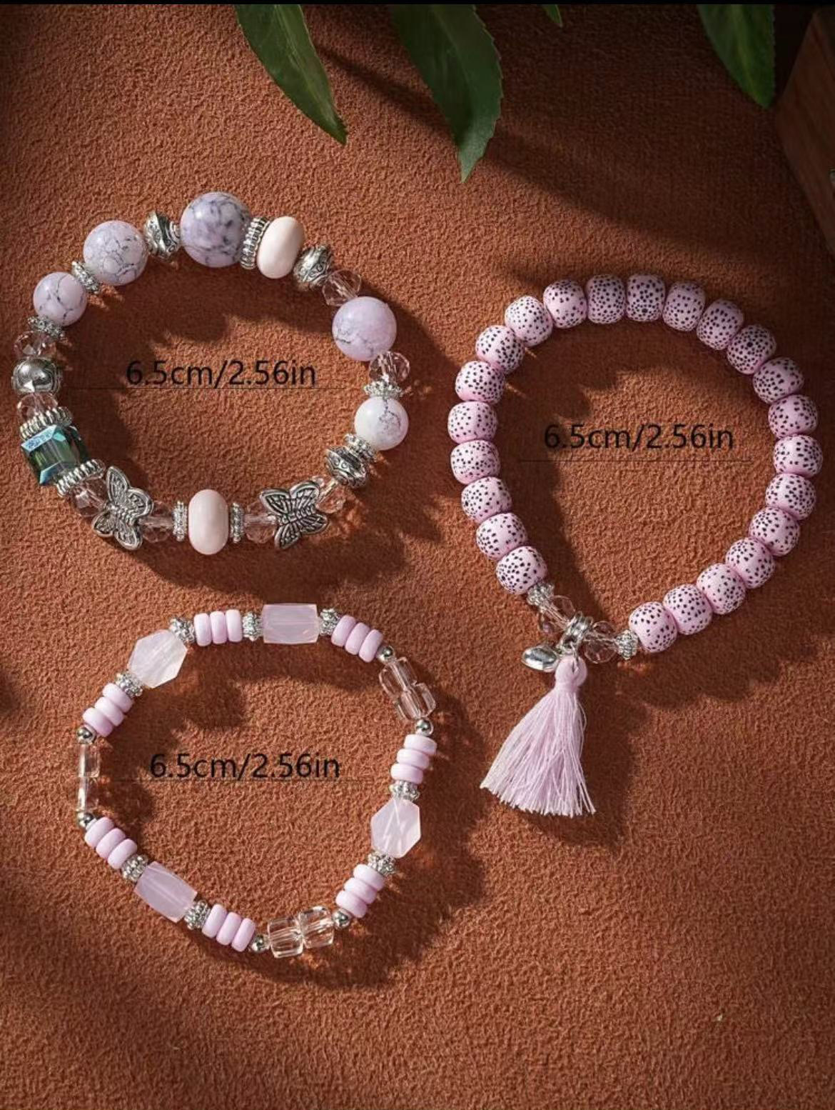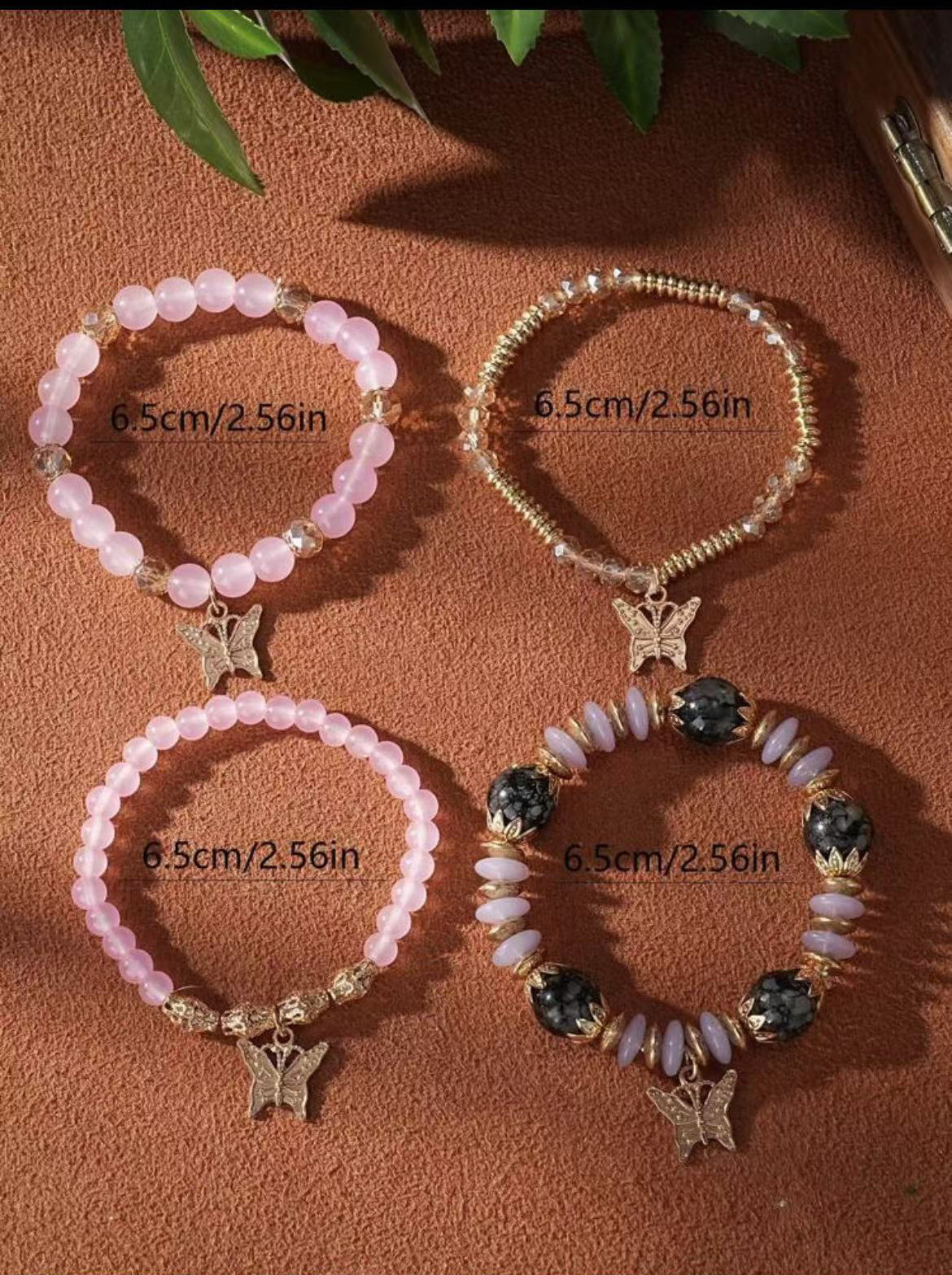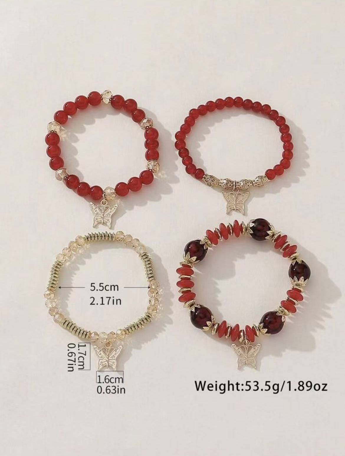 | Color | Juego de cuatro piezas de brazalete rojo, juego de cuatro piezas de brazalete rosa, juego de tres piezas de brazalete rosa y juego de tres piezas de brazalete verde |