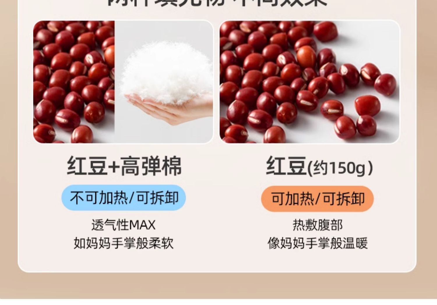| Relleno | Feijoles rojos (calentables) Feijoles rojos + algodón de alta elasticidad (no calentables) |
