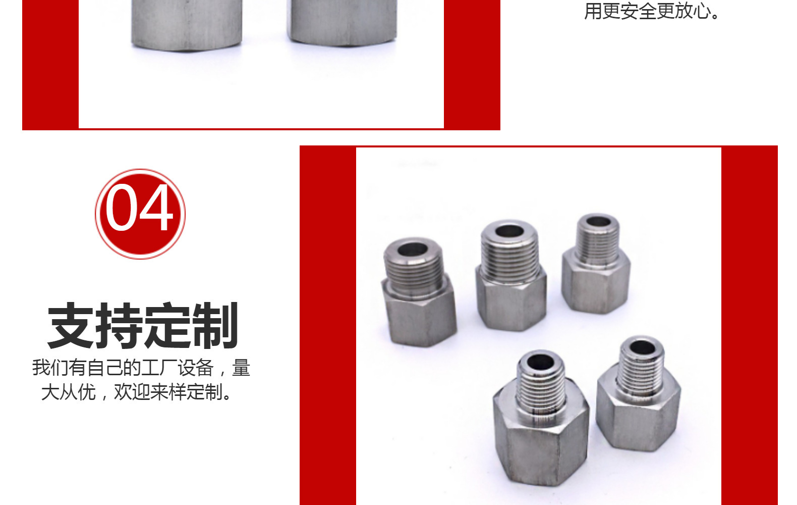 | Especificaciones | 304 / 3 puntos * 2 puntos (dn10 * dn08), 304 / 4 puntos * 2 puntos (dn15 * dn08), 304 / 4 puntos * 3 puntos (dn15 * dn10), 304 / 6 puntos * 2 puntos (dn20 * dn08), 304 / 6 puntos * 3 puntos (dn20 * dn10), 304 / 6 puntos * 4 puntos (dn20 * dn15), 304 / 1 pulgada * 2 puntos (dn25 * dn08), 304 / 1 pulgada * 3 puntos (dn25 * dn10), 304 / 1 pulgada * 4 puntos (dn25 * dn15), 304 / 1 pulgada * 1 pulgada * 6 puntos (dn25 * 20), 304 / 1,2 pulgadas * 4 minutos (dn32 * dn15), 304 / 1,2 pulgadas * 6 minutos (dn32 * dn20), 304 / 1,2 pulgadas * 1 pulgada (dn32 * dn25), 304 / 1,5 pulgadas * 4 minutos (dn40 * dn15), 304 / 1,5 pulgadas * 6 minutos (dn40 * dn20), 304 / 1,5 pulgadas * 1,2 pulgadas (dn40 * dn32), 304 / 2 pulgadas * 4 minutos (dn50 * dn15), 304 / 2 pulgadas (dn50 * 2 * 6 minutos (dn50 * dn50)20), 304 / 2 pulgadas * 1 pulgada (dn50 * dn25), 304 / 2 pulgadas * 1,2 pulgadas (dn50 * dn32), 304 / 2 pulgadas * 1,5 pulgadas (dn50 * dn40), 304 / 2,5 pulgadas * 1,5 pulgadas (dn65 * dn40), 304 / 2,5 pulgadas * 2 pulgadas (dn65 * dn50), 304 / 3 pulgadas * 2 pulgadas (dn80 * dn50), 304 / 3 pulgadas * 2,5 pulgadas (dn80 * dn65), 304 / 4 pulgadas * 2 pulgadas (dn100 * dn50), 304 / 4 pulgadas * 2,5 pulgadas (dn100 * dn65), 304 / 4 pulgadas * 3 pulgadas (dn100 * dn85), 304 filamentos internos y externos de igual diámetro dn15 = 4 minutos, 304 filamentos internos y externos dn20 = 6 minutos, 304 filamentos internos y externos dn25 = 1 pulgadas |