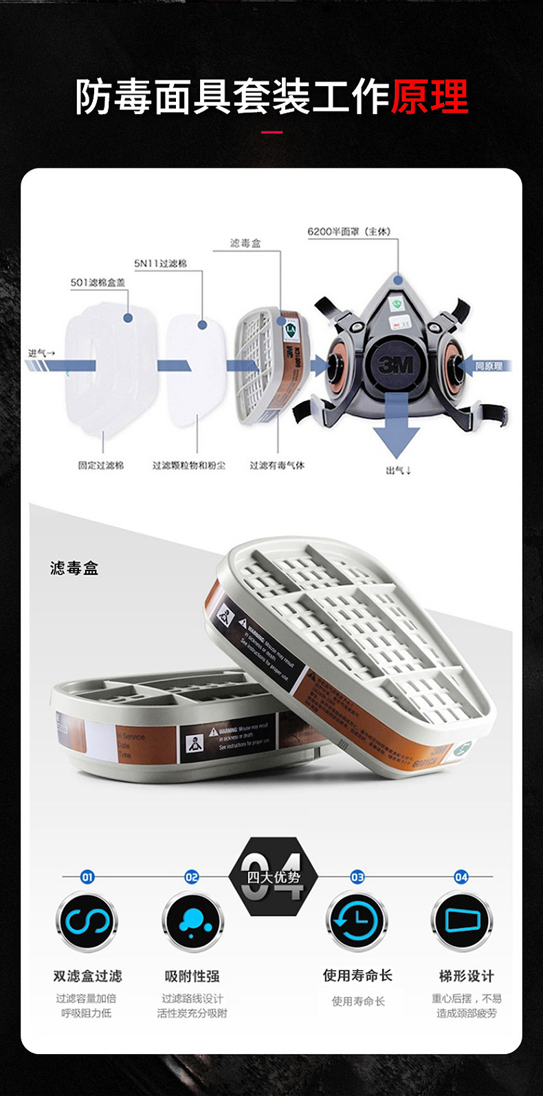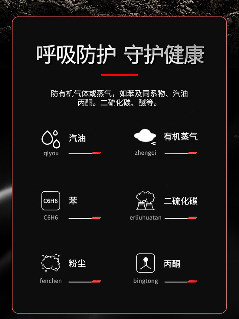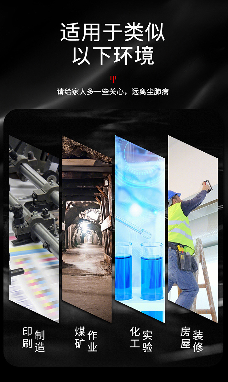 | Ámbito de uso | La protección del respirador filtra el polvo y filtra gases nocivos al mismo tiempo, como decoración de pintura en aerosol, industria química de minas de carbón, etc. |
