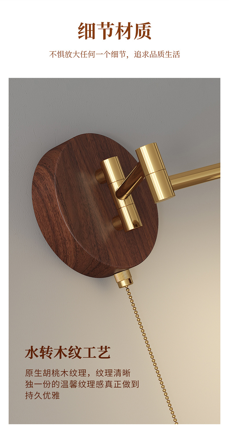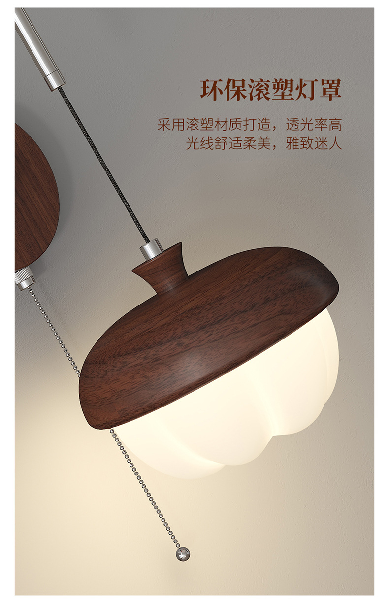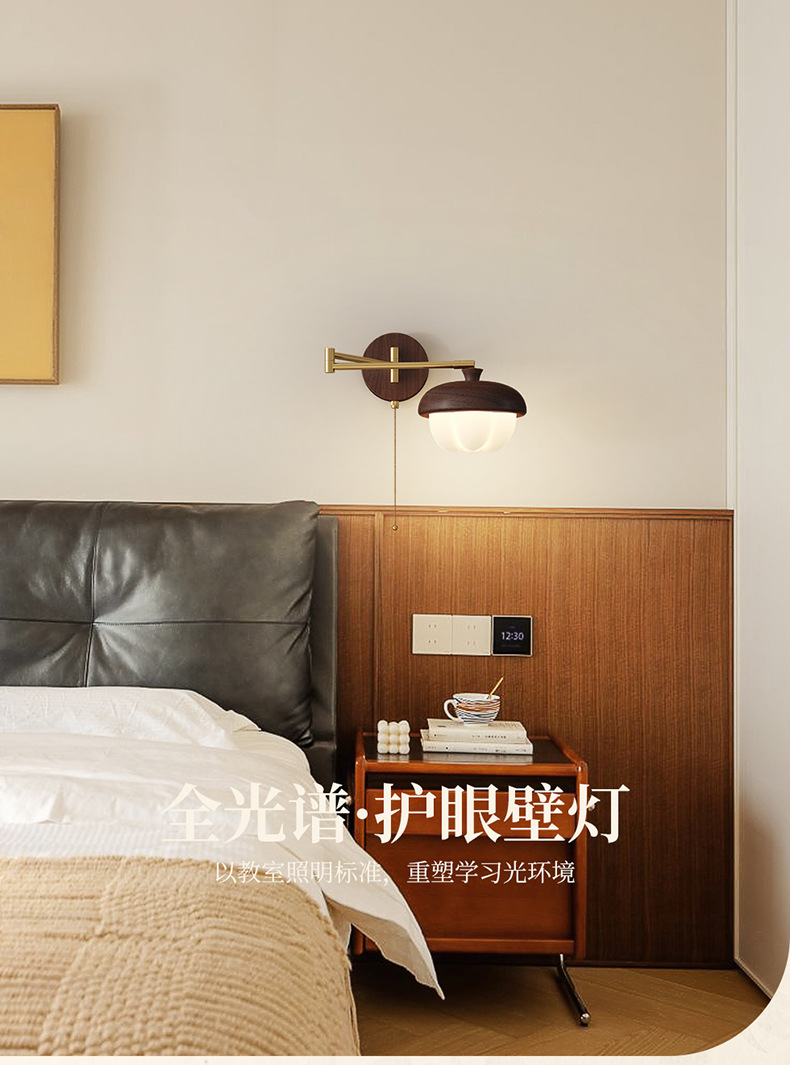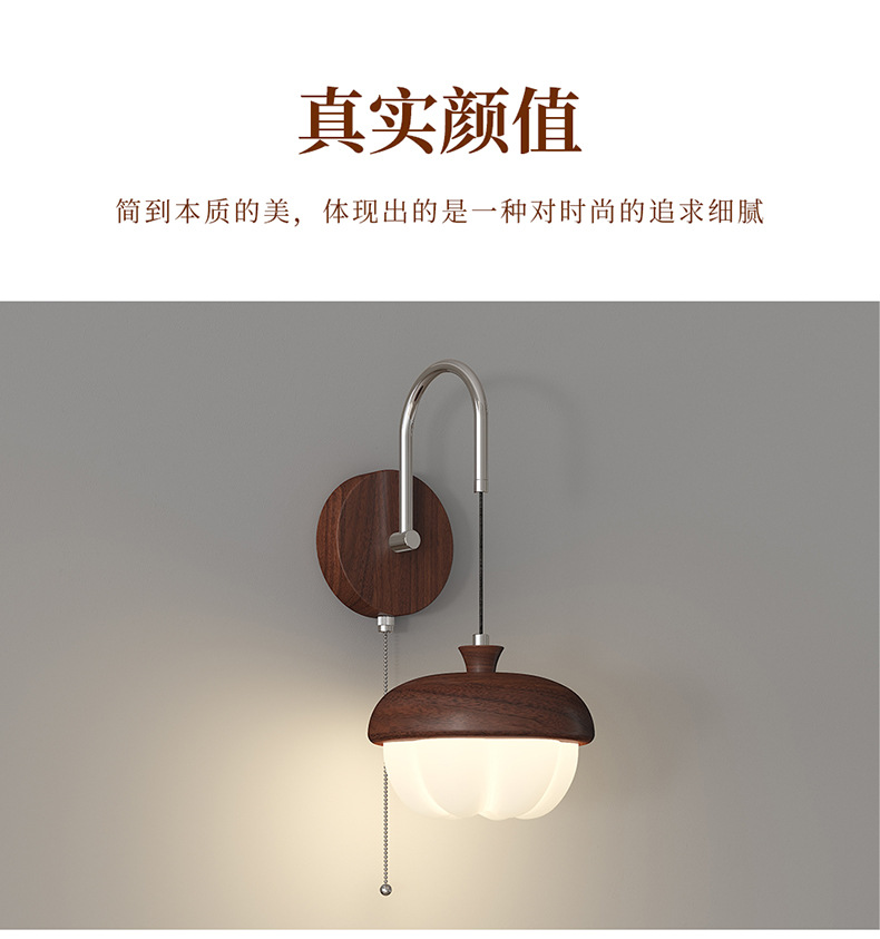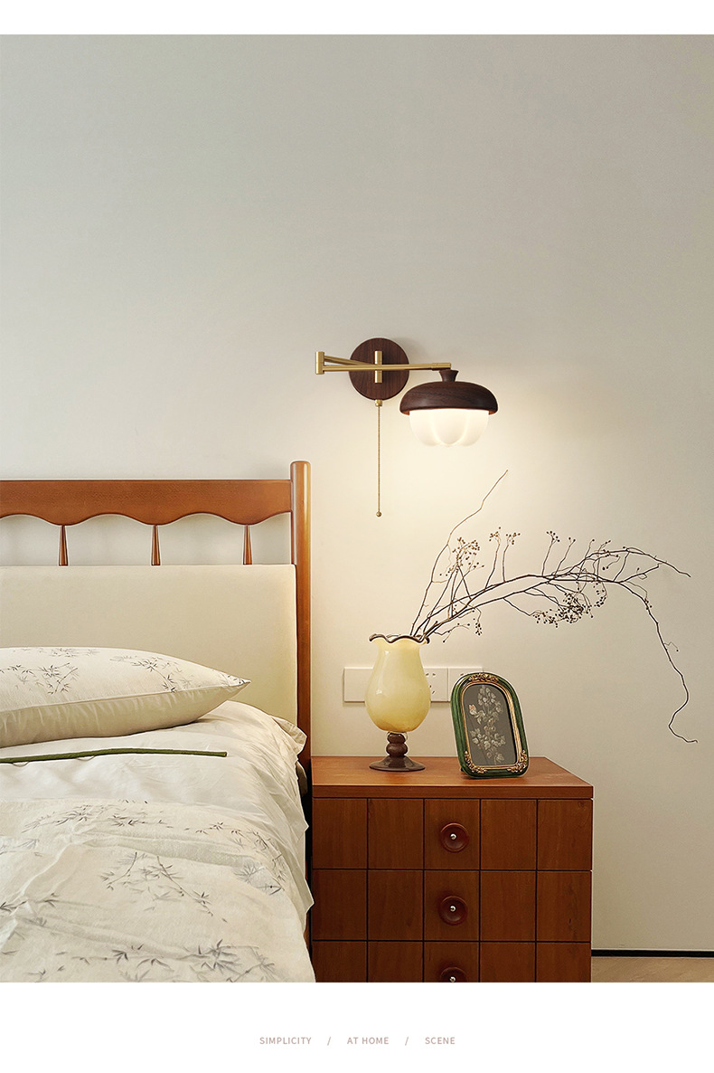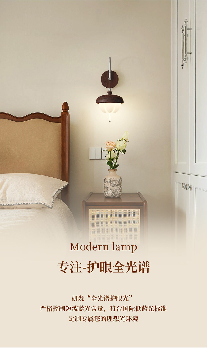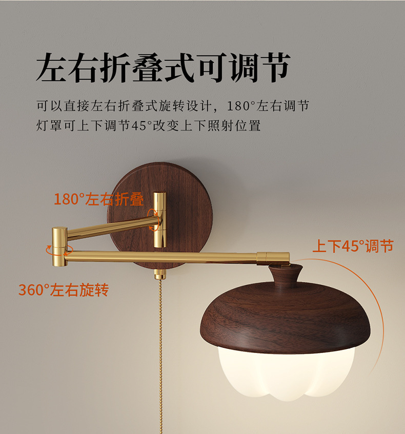 Lámpara de pared móvil con balancín de cabecera de viento de mediana edad, textura de madera de melocotón de calabaza creativa, luz de pared de fondo de dormitorio de sala de estar de espectro completo