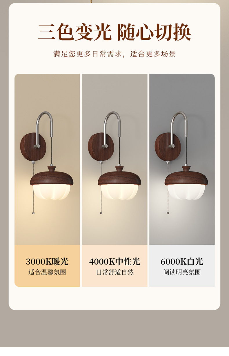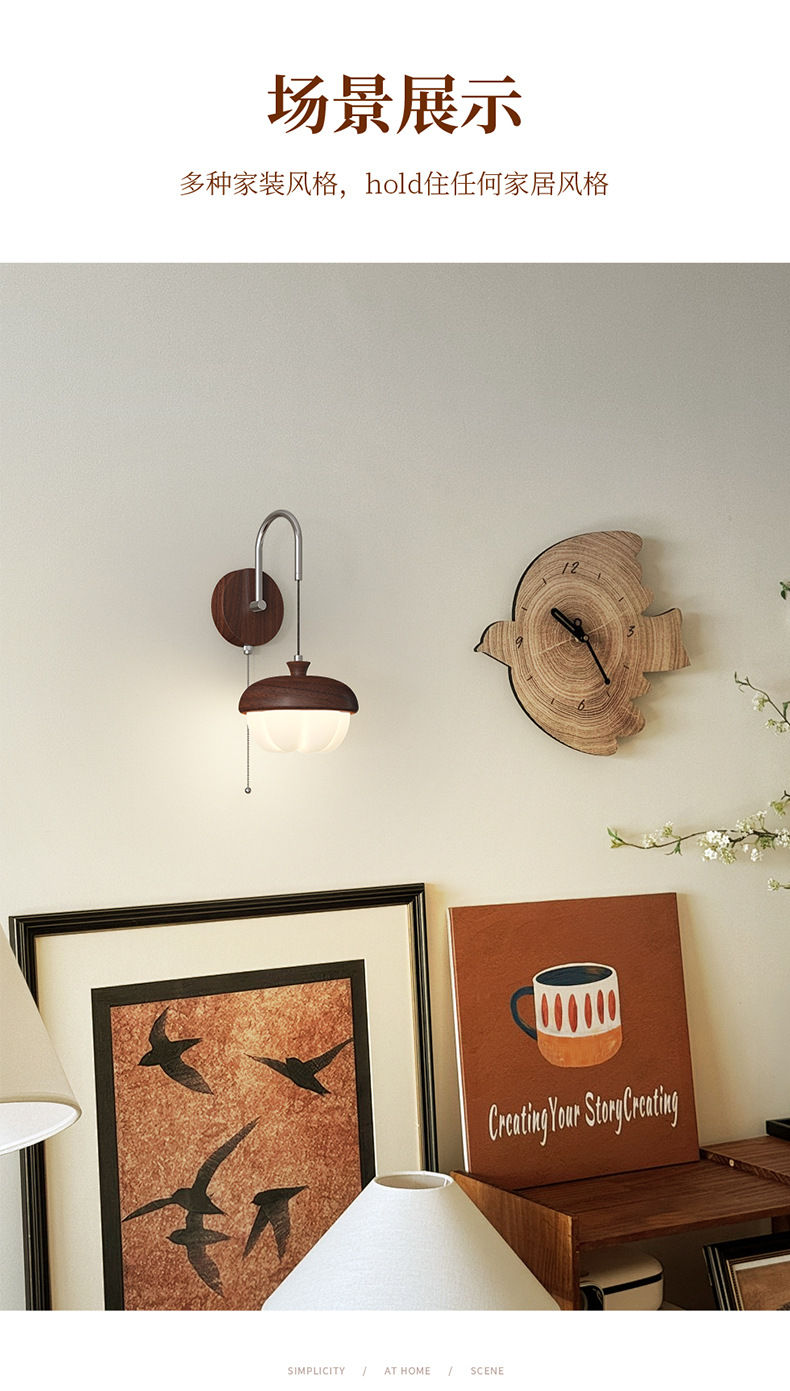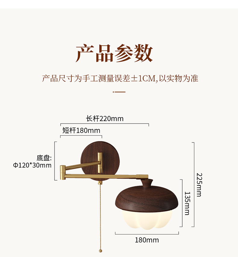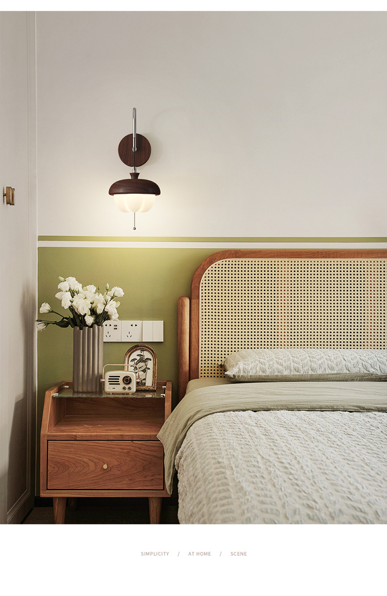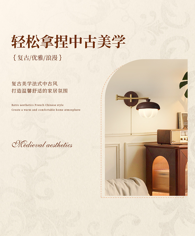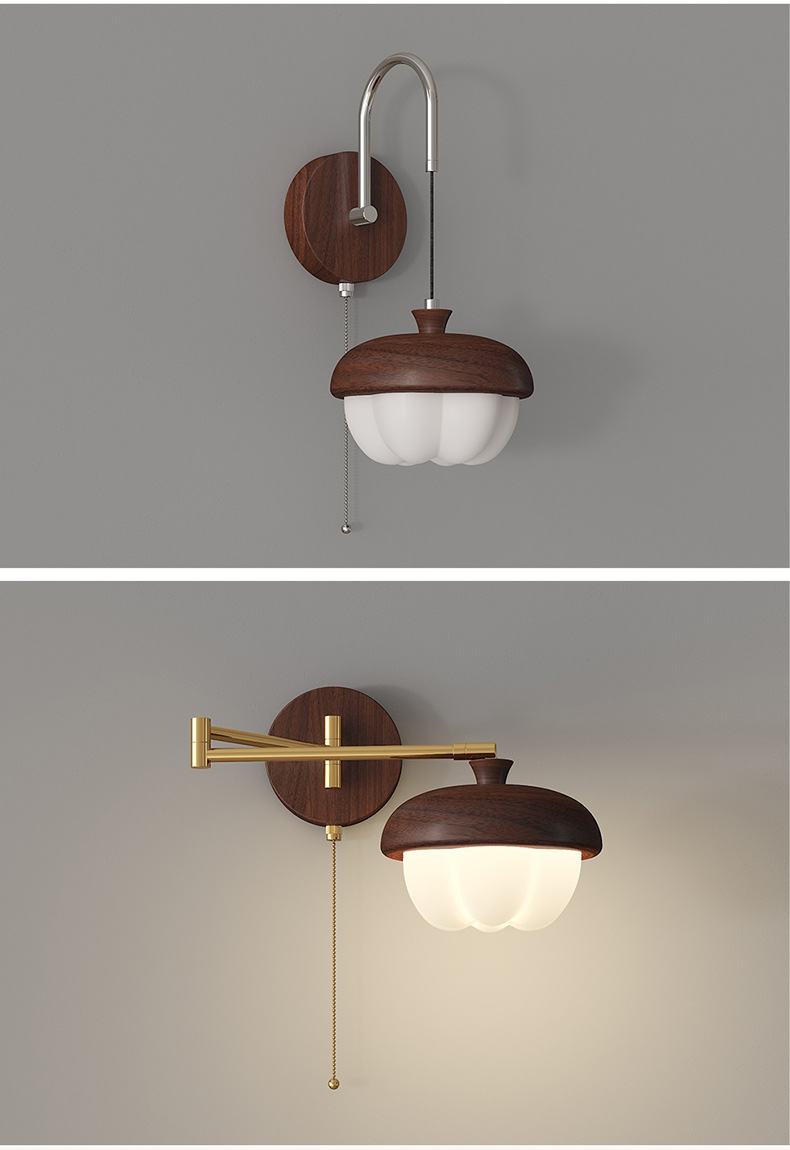Lámpara de pared móvil con balancín de cabecera de viento de mediana edad, textura de madera de melocotón de calabaza creativa, luz de pared de fondo de dormitorio de sala de estar de espectro completo