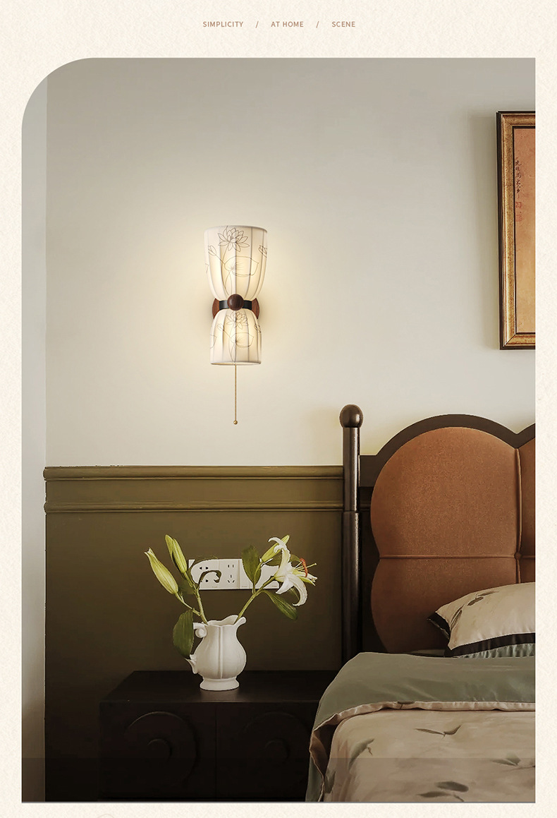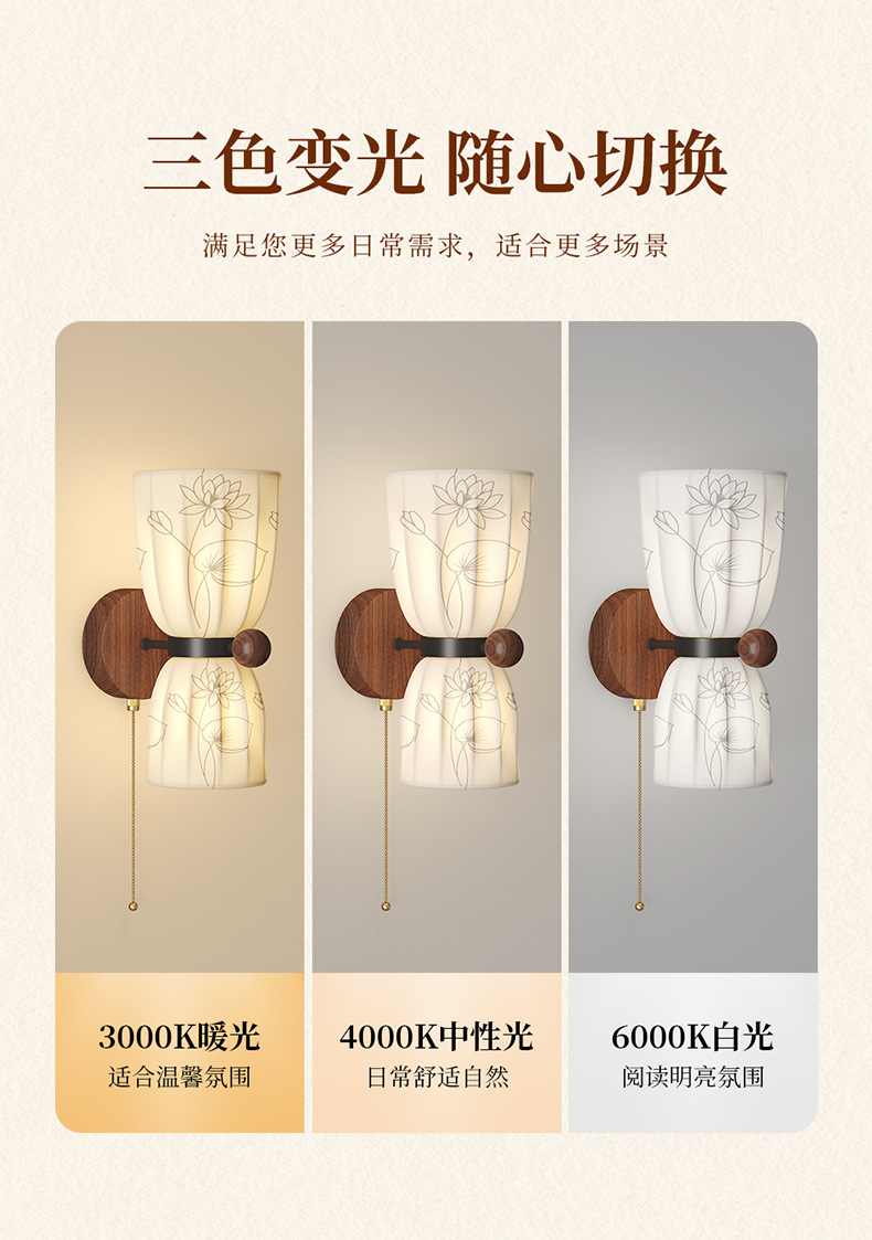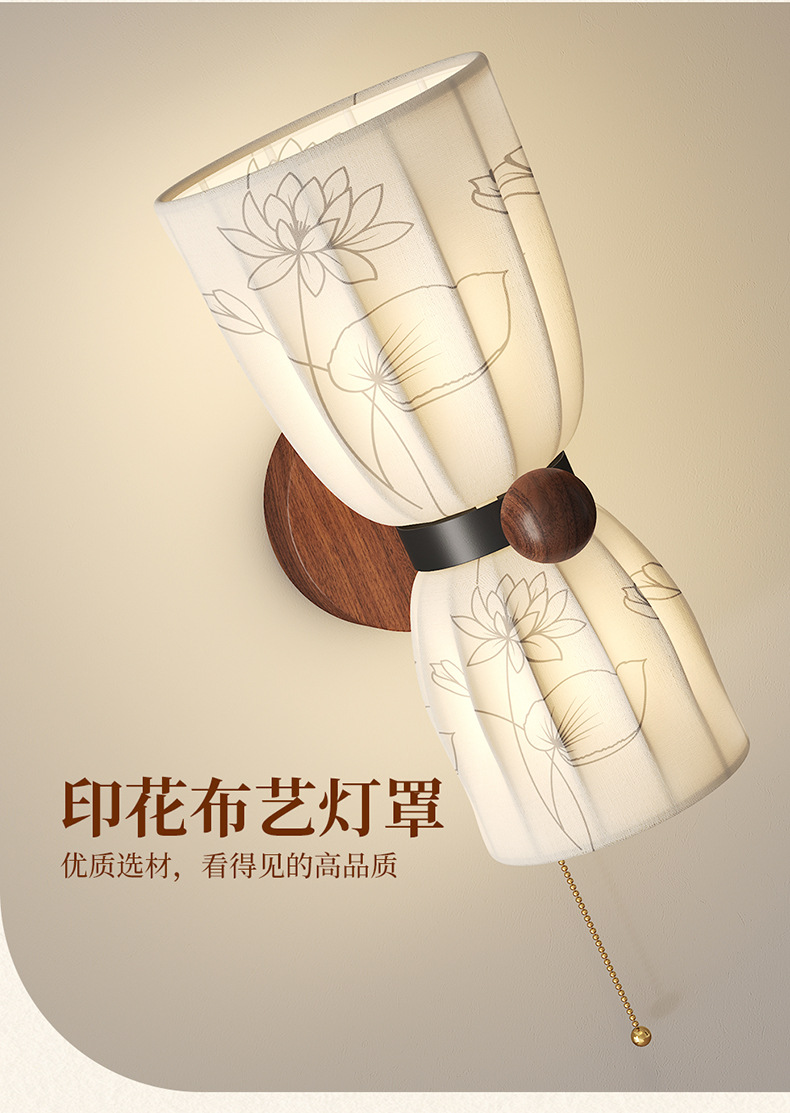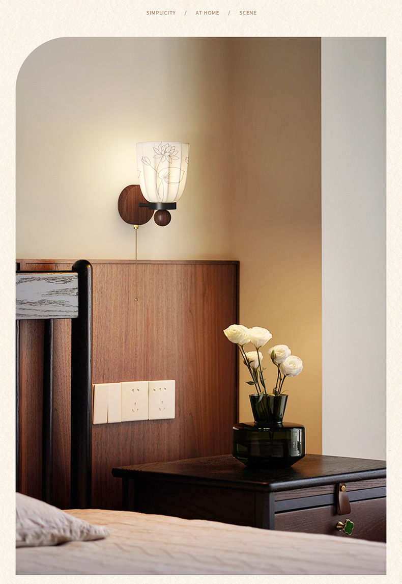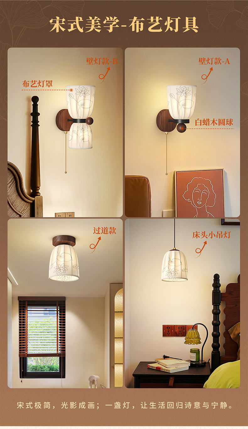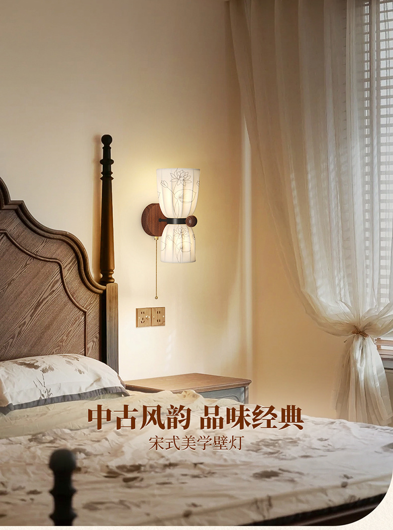 Estilo medio, dinastía Song, estética, lámpara de pared junto a la cama, grano de madera de nogal, sala de estar retro, dormitorio, iluminación de pared de fondo, 2025 nuevo