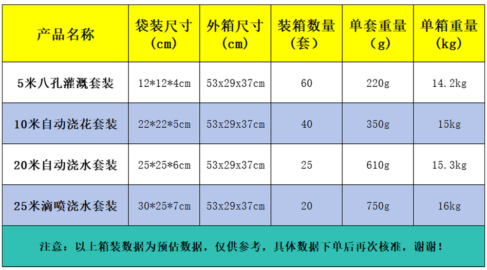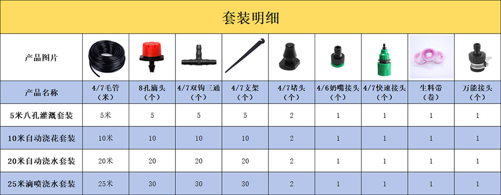 | Especificaciones | Juego de riego de cinco metros y ocho agujeros,Juego de riego automático de 10 m,Juego de riego automático de 20 m,Juego de riego por goteo de 25 m |