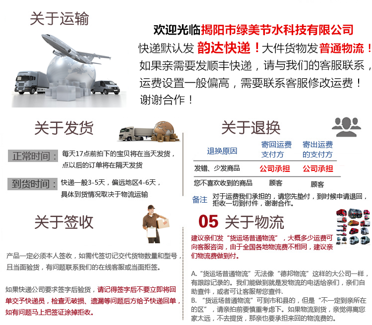 揭阳市绿美节水科技有限公司主要经营农业节水灌溉产品和家庭花园灌溉工具。农业节水灌溉产品主要包括:离心式过滤器,叠片式过滤器,网式过滤器,文丘里施肥器,旋转微喷头,折射雾化微喷头,压力补偿滴头,8孔可调流量滴头,红旗滴头,可调摇臂喷头,蝶形雨状喷头,PE管及管件,贴片式滴灌带及管件,3/5 4/7 8/12毛管及配件,打孔器等!产品广泛应用于农业大田喷、滴灌;温室大棚种植微喷灌溉;园林、道路绿化工程养护灌溉;室内立体绿化灌溉;以及畜禽养殖的降温消毒等领域。