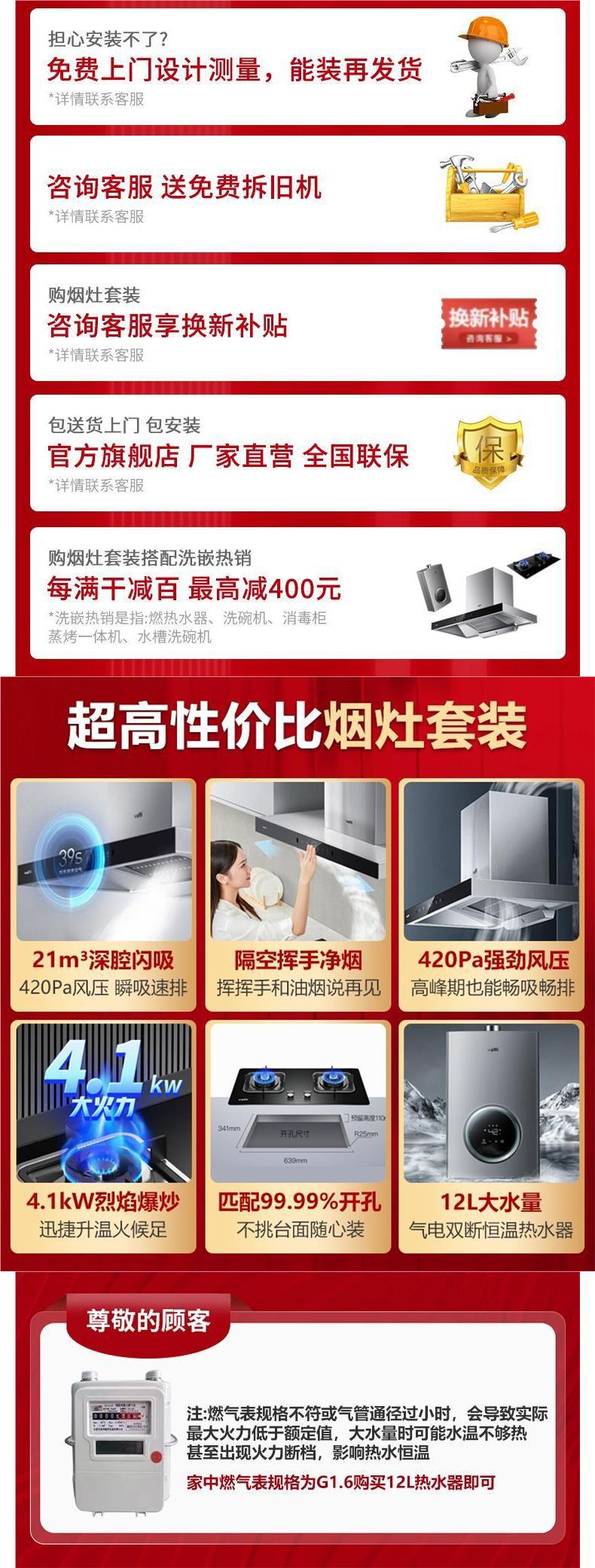 Set de combinación de calor de cocina de humo de tres piezas de cocina de humo doméstica calentador de agua de alta succión cocina de fuego rápido