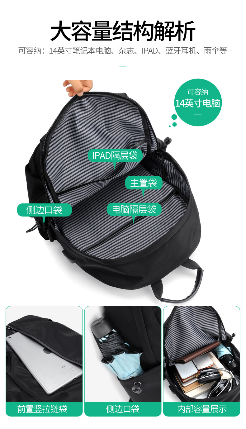 Mochila de estudiante de negocios casual mochila de 14 pulgadas Bolsa de ordenador interfaz de carga USB mochila de los hombres