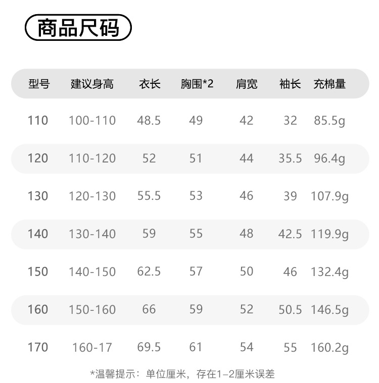 | Adecuado para la altura | 110 volumen de relleno 85.5 g, 120 volumen de relleno 96.4 g, 130 volumen de relleno 107.9 g, 140 volumen de relleno 119.9 g, 150 volumen de relleno 132.4 g, 160 volumen de relleno 146.5 g, 170 volumen de relleno 160.2 g |