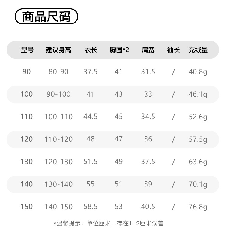 | Adecuado para la altura | 90 volumen de llenado de cachemira 40,8g,100 volumen de llenado de cachemira 46,1g,110 Volumen de llenado de lana 51,6g,120 volumen de llenado de cachemira 57,5g,130 volumen de llenado de cachemira 63,6g,140 Volumen de llenado de cachemira 70,1g,150 volumen de llenado de cachemira 76,8g |