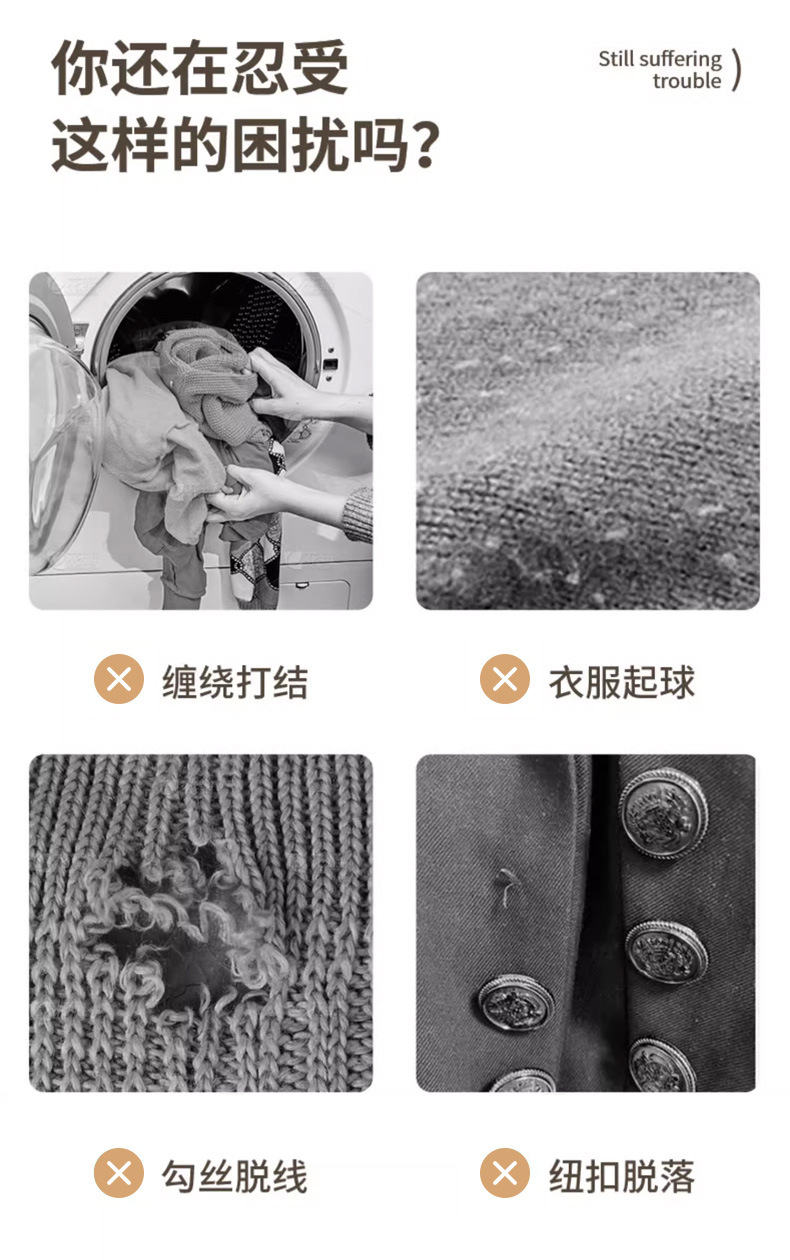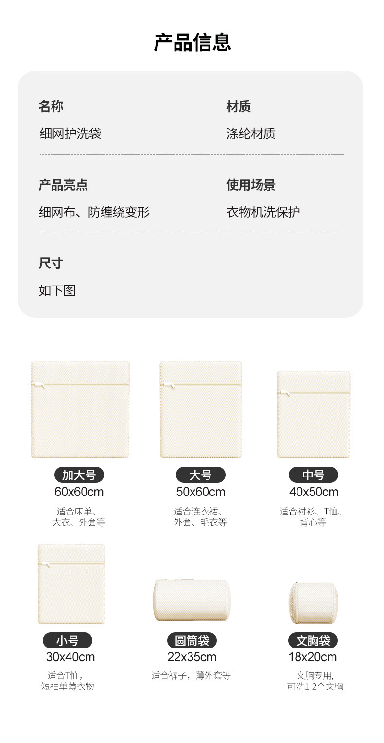 | Especificaciones | Bolsa de malla fina 18*20cm,Cilindro de pantalón 22*35cm,30*40cm,40*50cm,50*60cm,60*60cm,Juego de seis piezas |