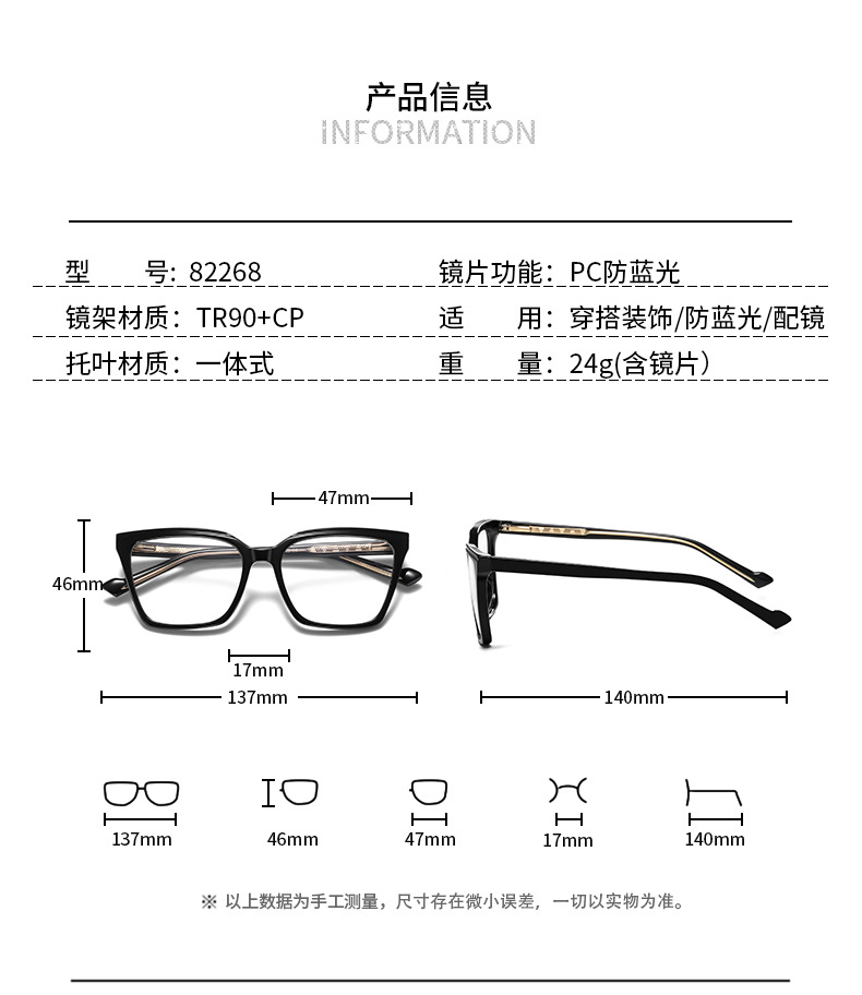 | Color del marco | C1 negro brillante/anti-luz azul,C2 pasta de frijoles/anti-luz azul,C3 a través del gris/blanco/anti-luz azul,C4 transparente verde/anti-luz azul,C5 a través del té/anti-luz azul,C6 blanco/anti-luz azul,C7 gris violeta/transparente en polvo/anti-luz azul,C8 a través del gris/a través del polvo/anti-luz azul |