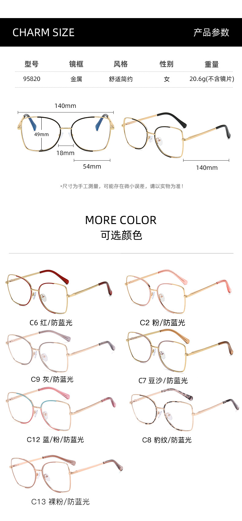 | Color del marco | Polvo C2/luz anti-azul,C5 Negro/luz anti-azul,C7 camafeo marrón/luz anti-azul,Estampado de leopardo C8/luz anti-azul,Luz gris/anti-azul C9,C12 azul/rosa/luz anti-azul |