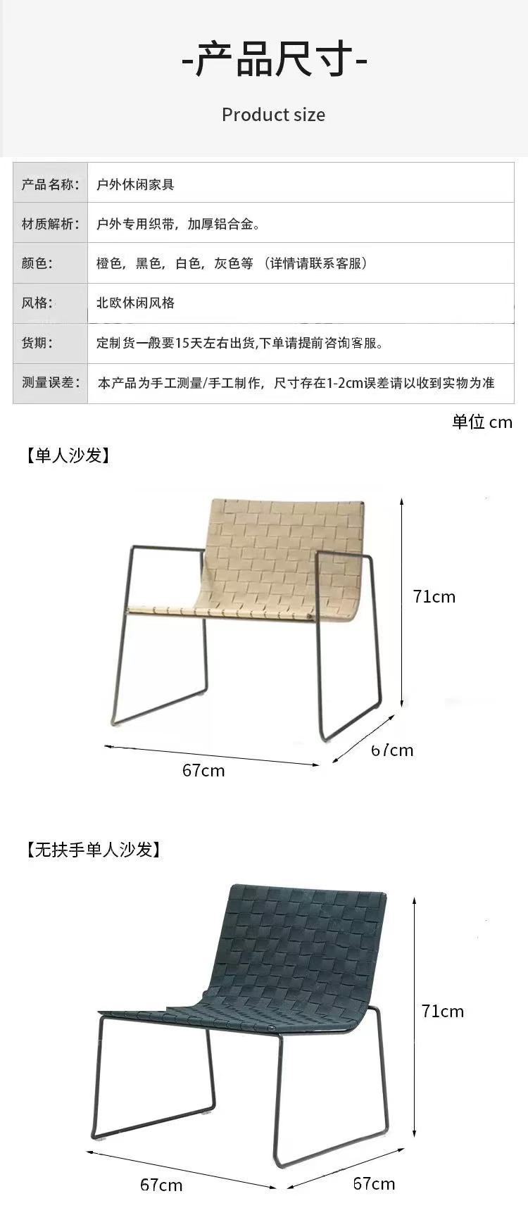 | Color | Sofá individual, sofá individual sin reposabrazos, reposabrazos, sillas de bar, cama tumbada, 2 sofás individuales + Mesa de café, 4 sofás individuales + Mesa de café, 4 sofás individuales + Mesa de café + paraguas de madera en forma de siete caracteres 3m, sin reposabrazos |