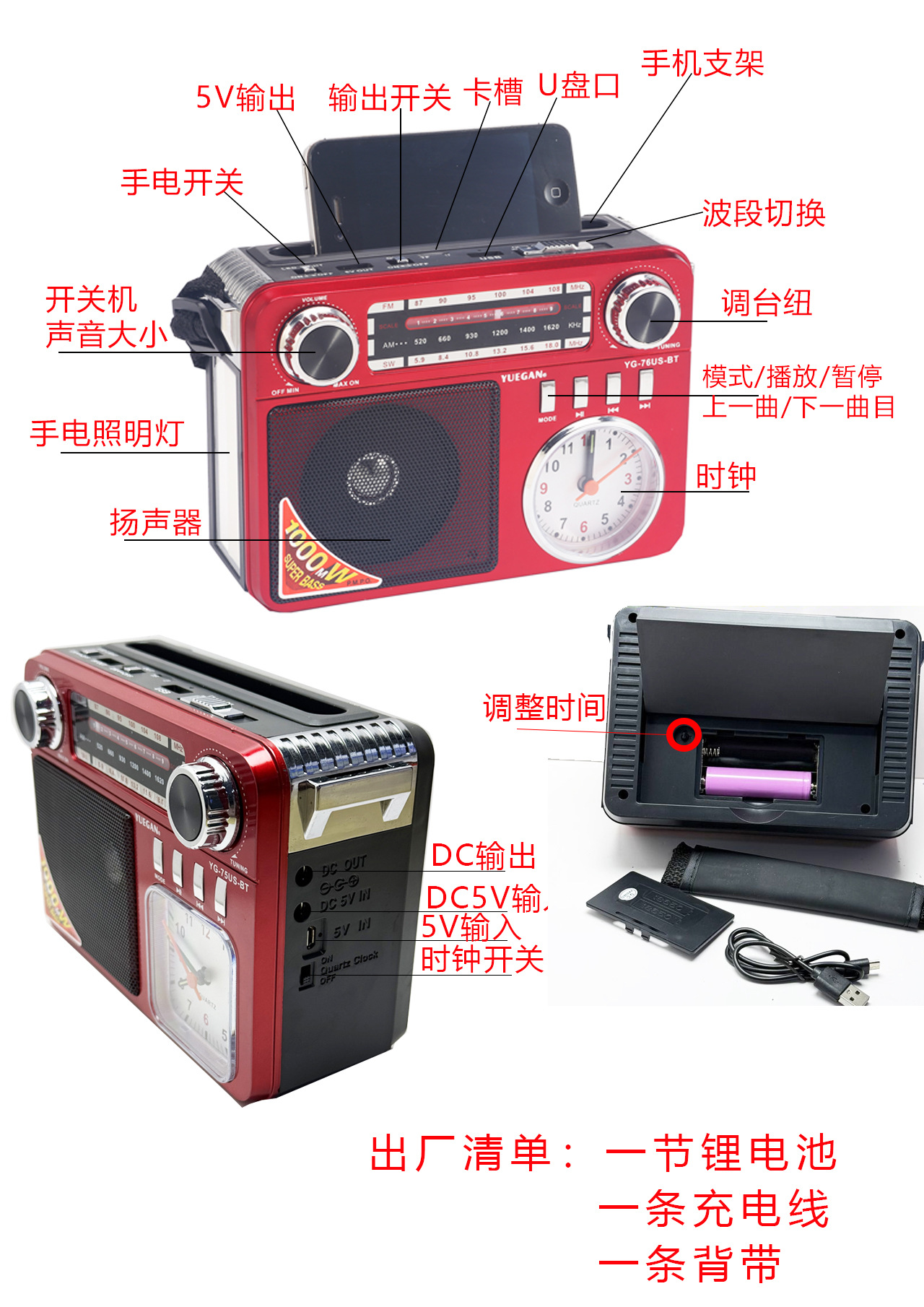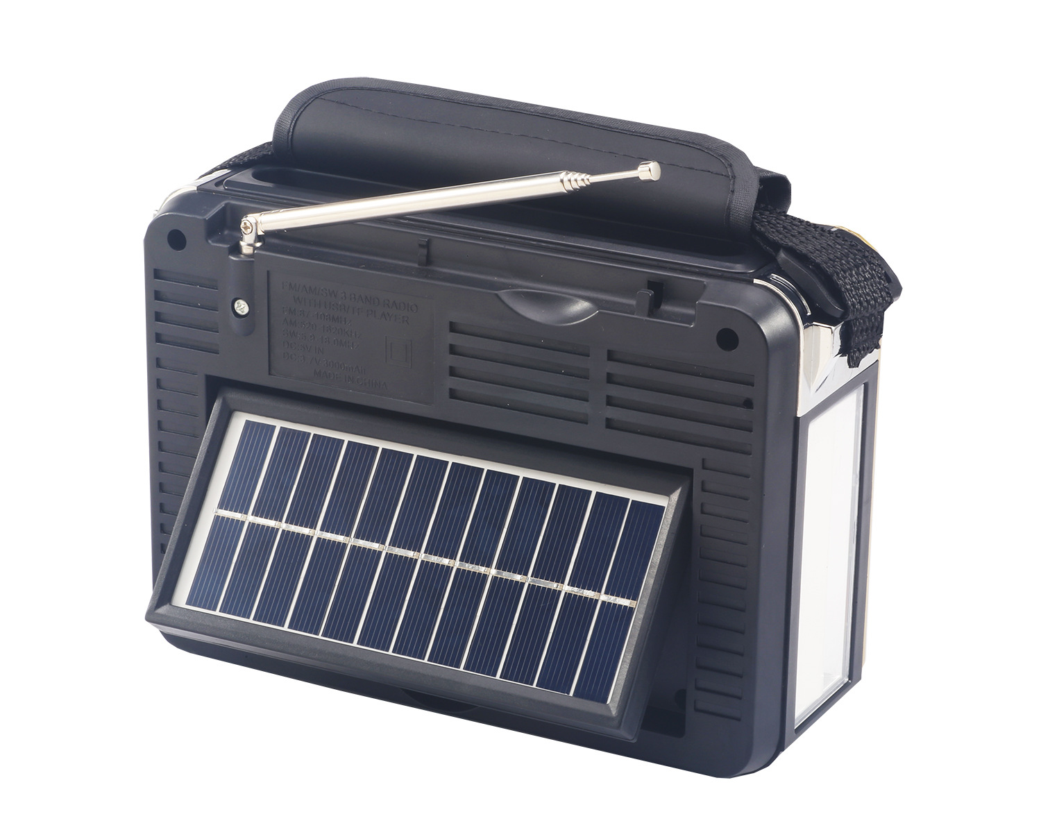 FM/AM/SW 3BAND USB/TF MP3PLAYER DC:5V With a lithium battery(18650) With LED lights Solar panels With Bluetooth