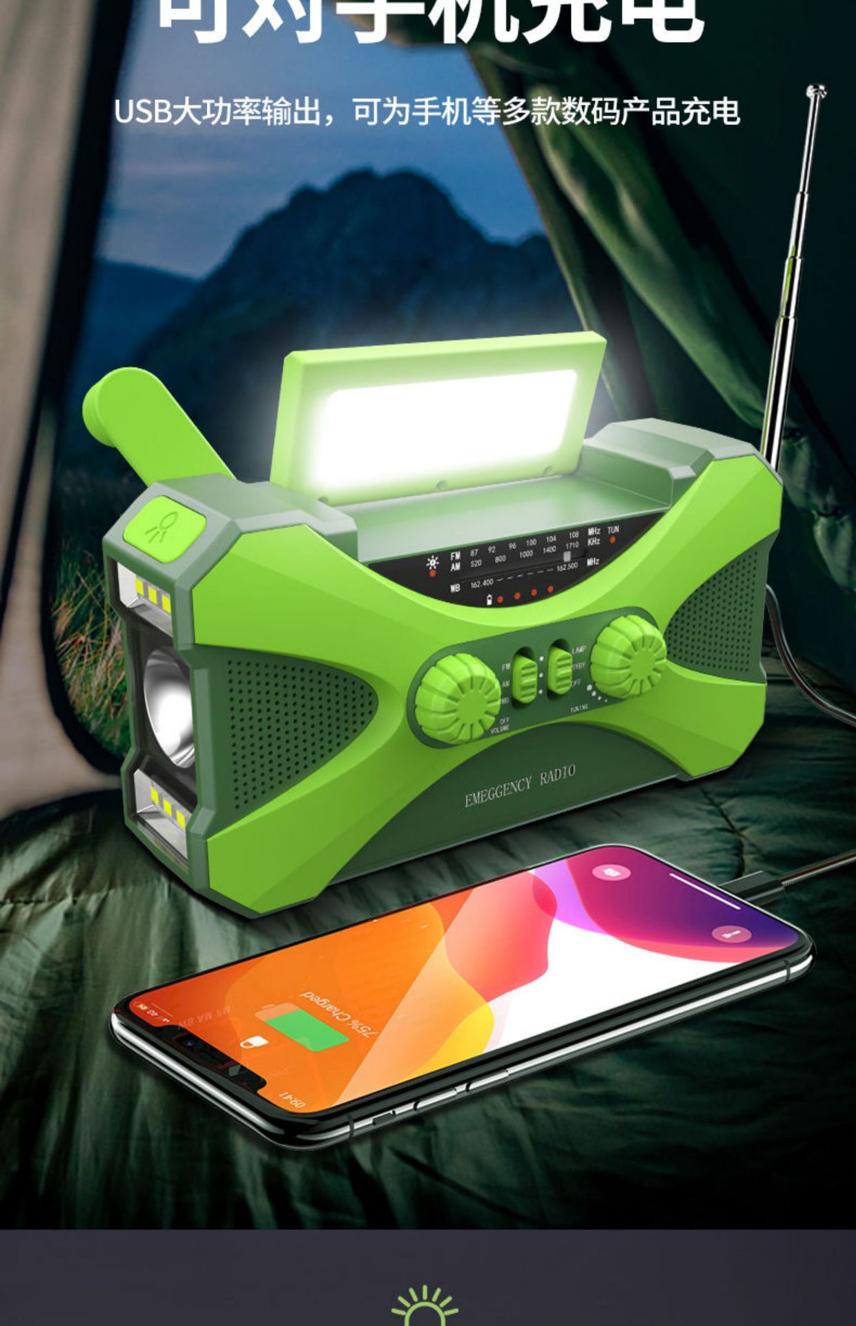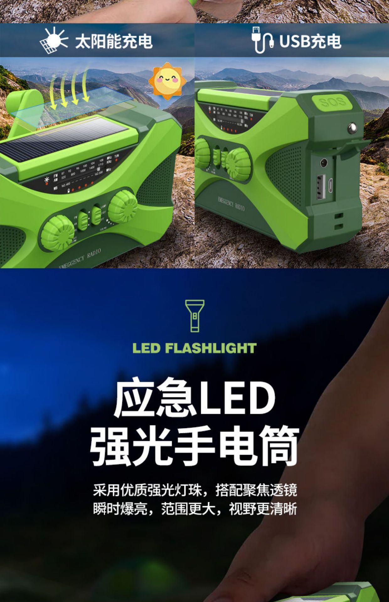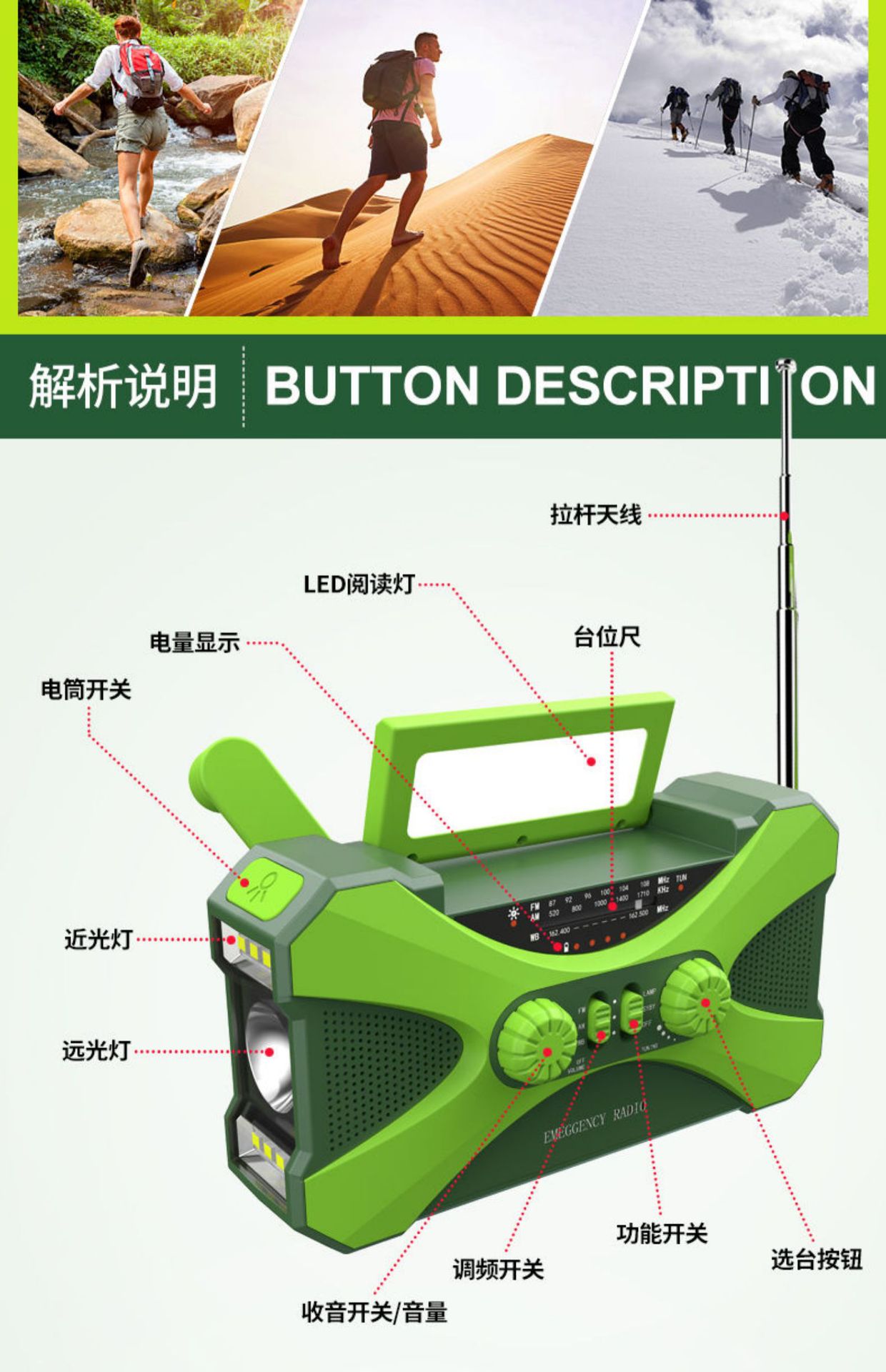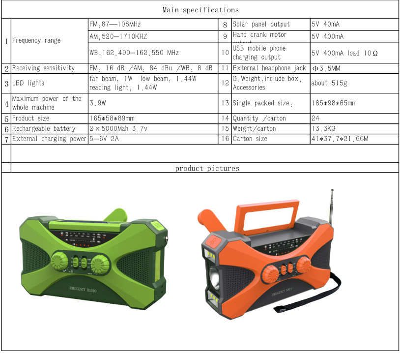 2.产品功能: AM/ FM /NOAA Weather radio/照明/阅读灯/SOS报警/太阳能/手摇发电