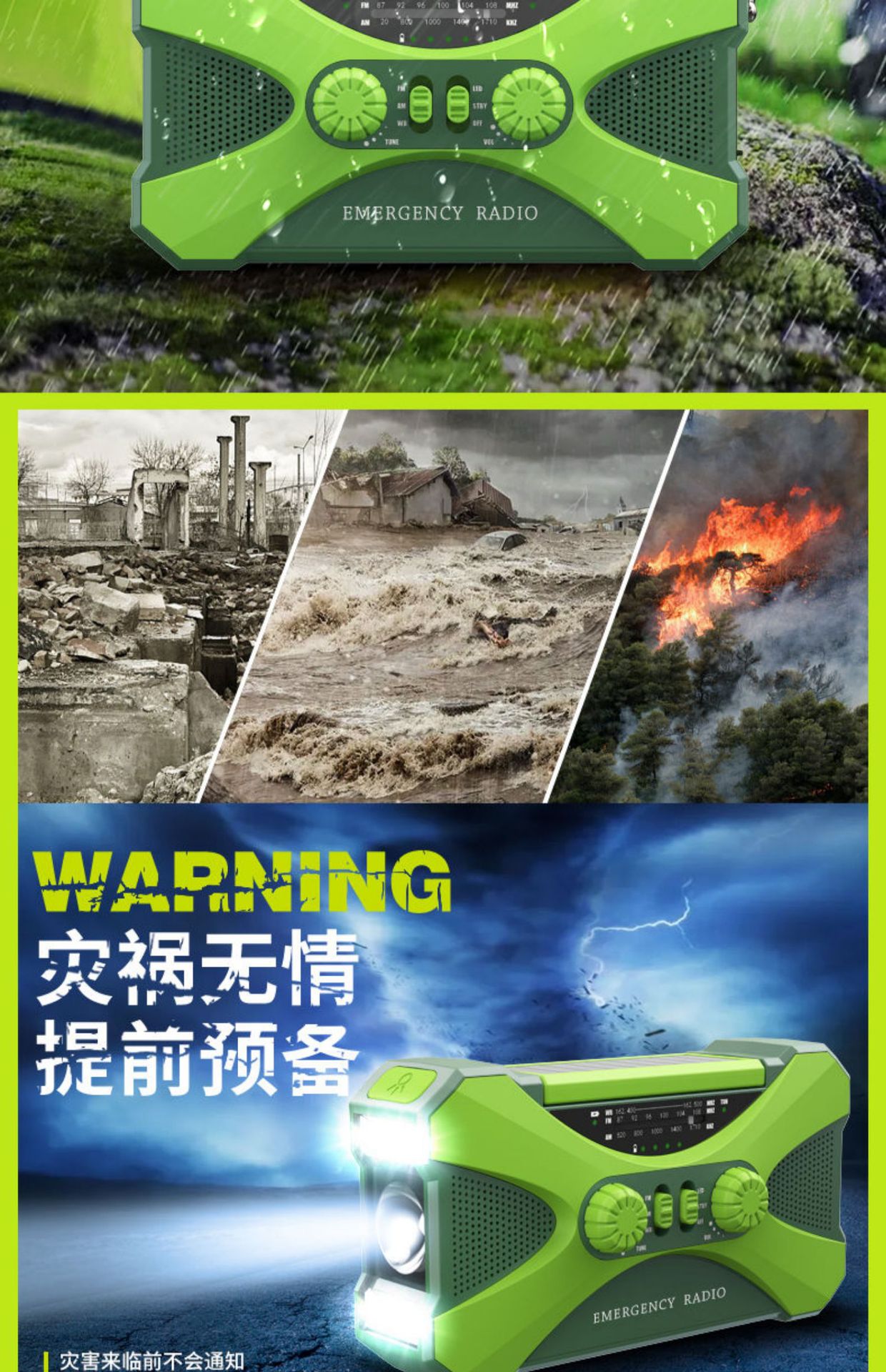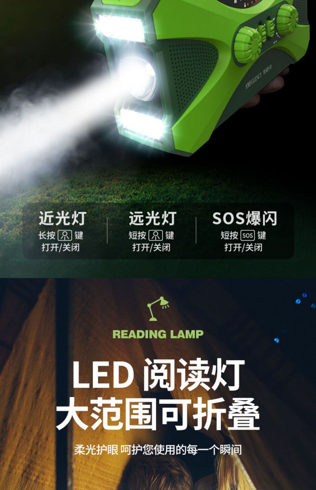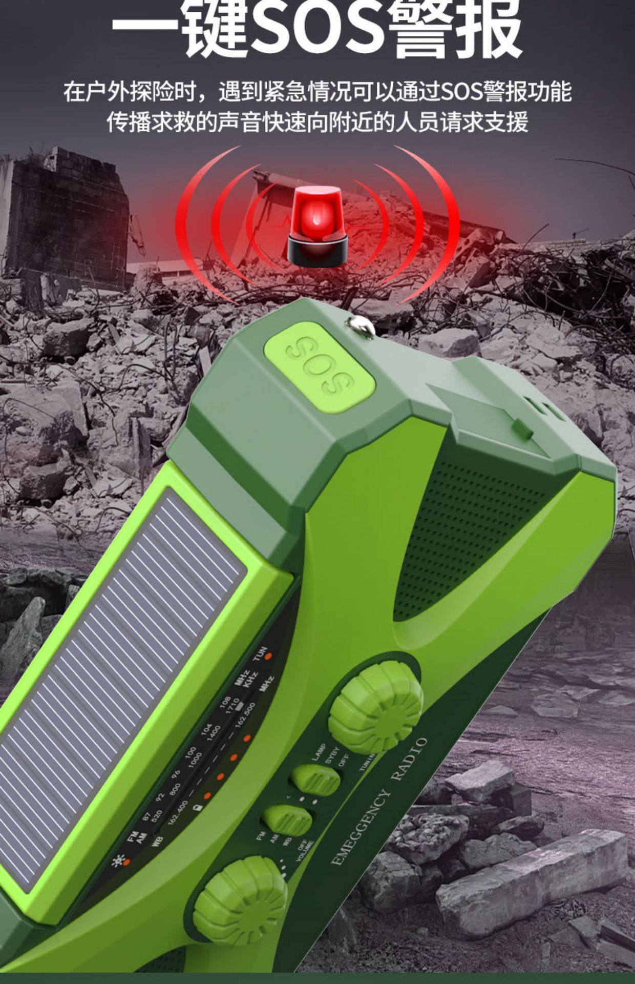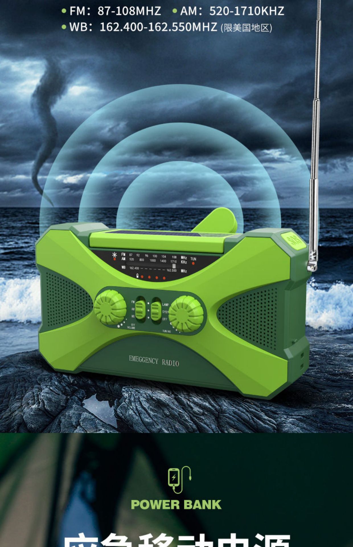 2.产品功能: AM/ FM /NOAA Weather radio/照明/阅读灯/SOS报警/太阳能/手摇发电