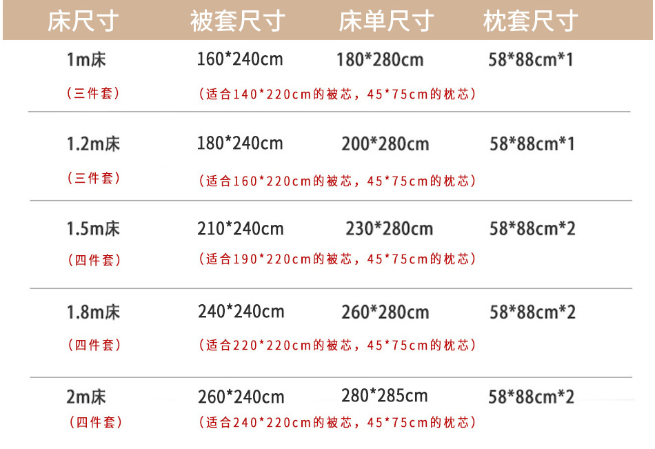 | Especificaciones de tamaño | Juego de cama de hotel de 1 metro, tres piezas (sábana encimera 180*280: funda nórdica 160*240: funda de almohada 58*88: apto para edredón de 140*220).,Hotel 1.2m cama de tres piezas (sábana 200*280: funda de edredón 180*240: funda de almohada 58*88: adecuada para edredón 160*220,Hotel 1.5m cama de cuatro piezas (sábanas 230*280: funda de edredón 210*240: funda de almohada 58*88: adecuado para edredón 190*220,Hotel 1.8m cama de cuatro piezas (sábana 260*280: funda de edredón 240*240: funda de almohada 58*88: adecuado para 220*220 edredón,Hotel 2m cama de cuatro piezas (sábana 280*285: funda de edredón 260*240: funda de almohada 58*88*2: adecuado para 240*220 edredón,1m cama (sábanas 180*280) |