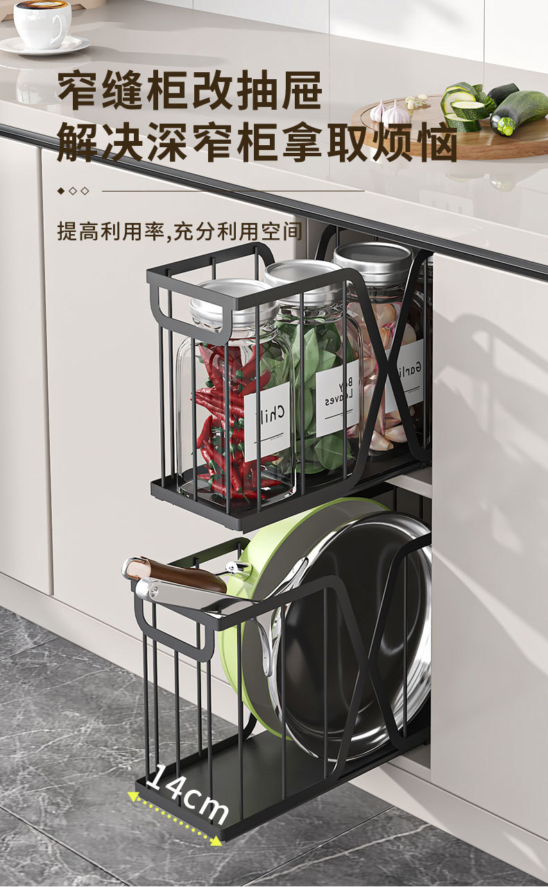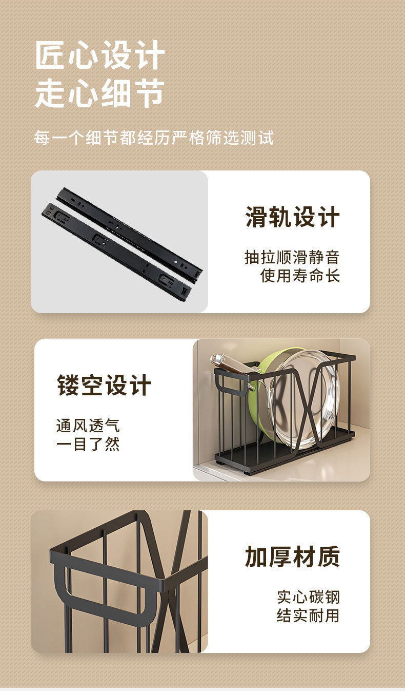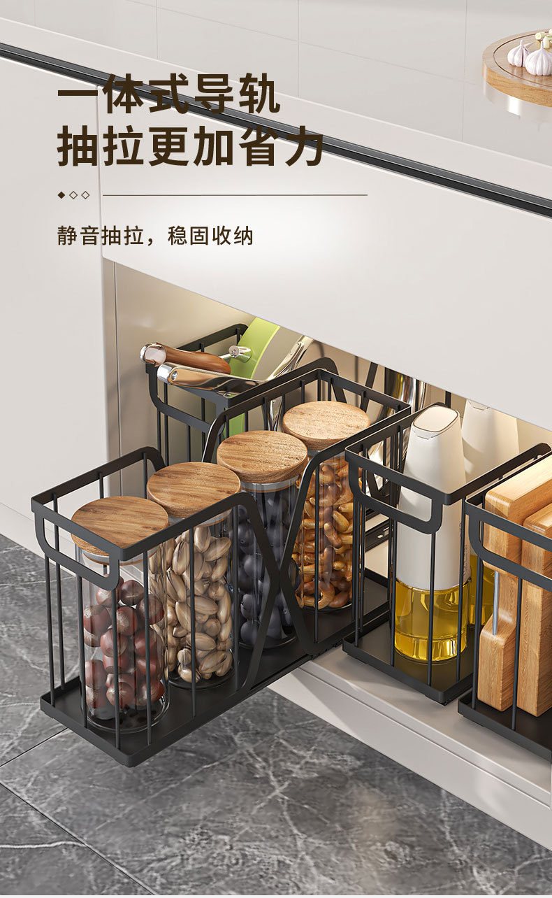 El estante del fregadero debajo de la cocina se puede tirar, la olla de almacenamiento multifuncional, el estante de acabado de artículos diversos, la cesta del cajón del armario