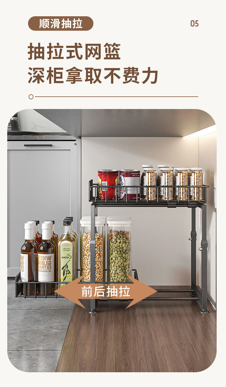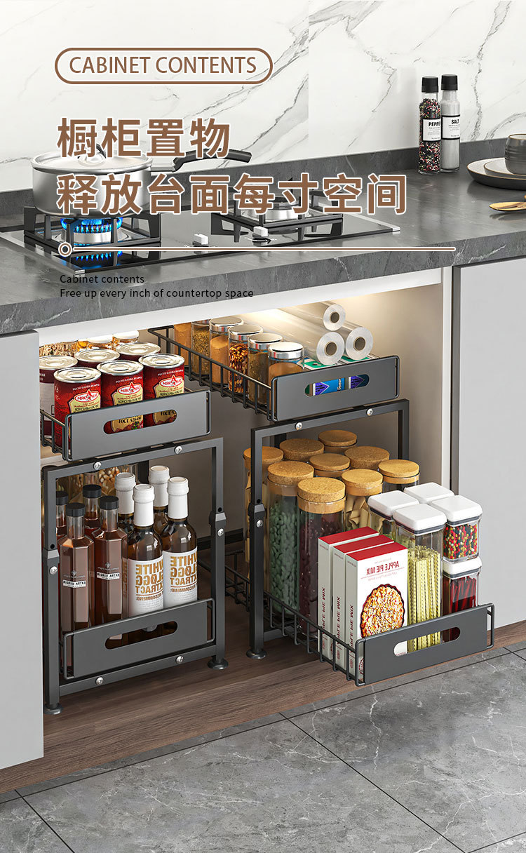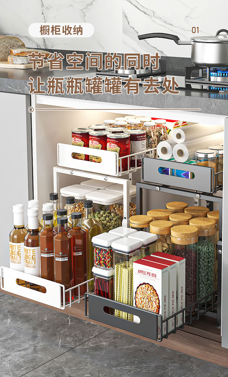 Estante de fregadero inferior transfronterizo Estante de almacenamiento multifuncional Estante de almacenamiento de botellas, latas, condimentos, bocadillos diversos, estante de acabado que se puede levantar y tirar