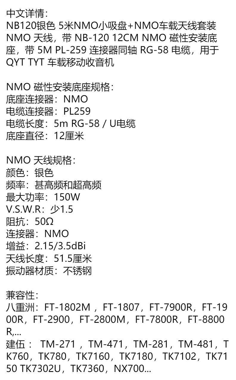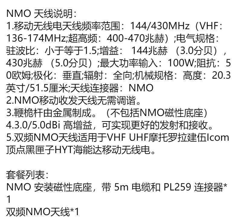 | Base de montaje magnético NMO | Conector de base: conector de cable NMO: PL259 Longitud del cable: 5M RG-58 / U diámetro de la base del cable: 9cm |