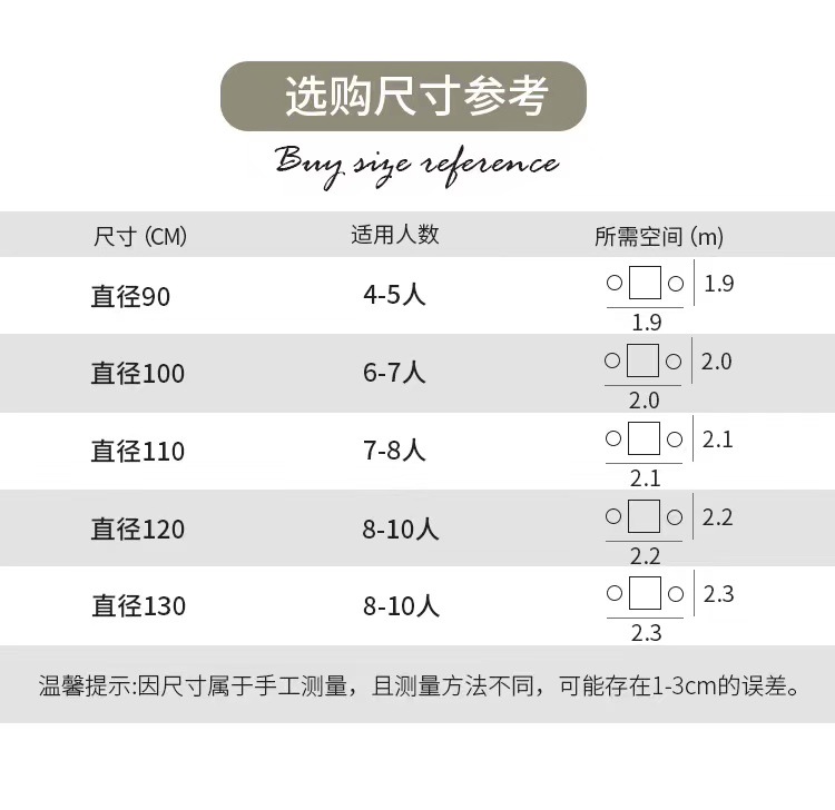 | Tamaño | Mesa única de 90 cm de diámetro, Mesa única de 100 cm de diámetro, Mesa única de 110 cm de diámetro, Mesa única de 120 cm de diámetro, Mesa única de 130 cm de diámetro, Mesa única de 140 cm de diámetro, servicio al cliente de consulta de tamaño personalizado, silla de comedor principal + 2, silla de comedor principal + 4, silla de comedor principal + 6 |