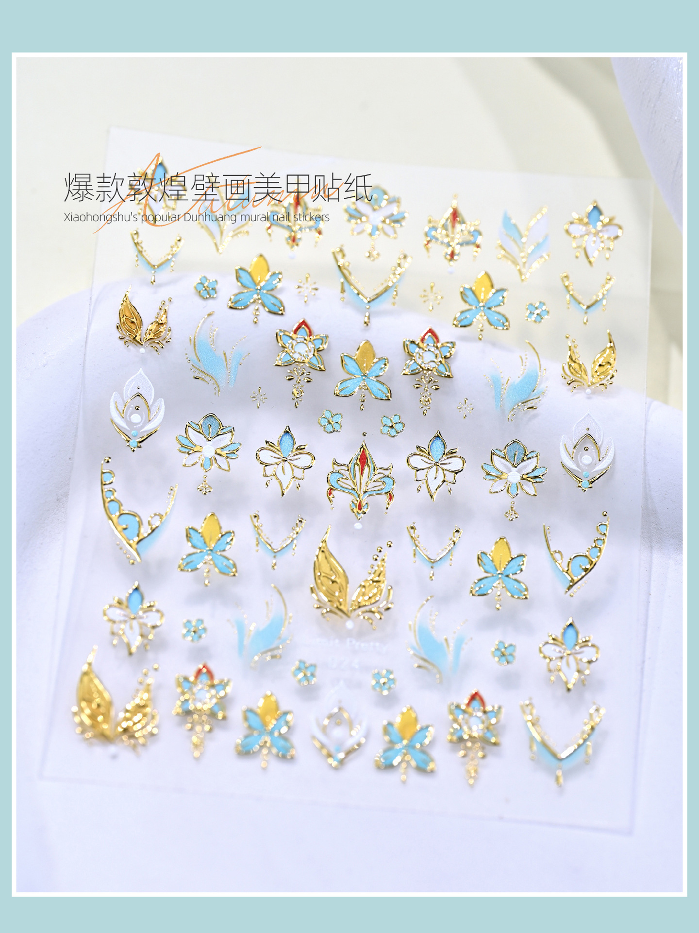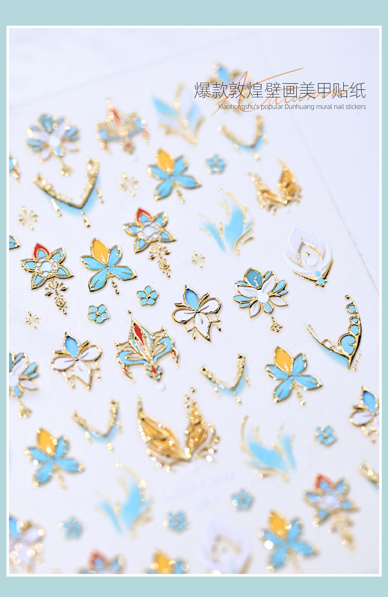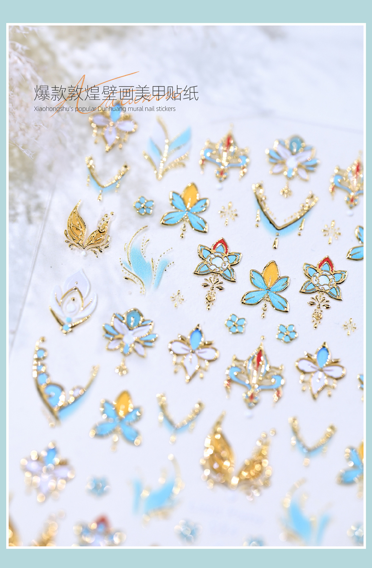 Nuevo estilo chino, elegante mural de Dunhuang, pegatinas de uñas, flores francesas en relieve, pegatinas de uñas de vestir tridimensionales al por mayor