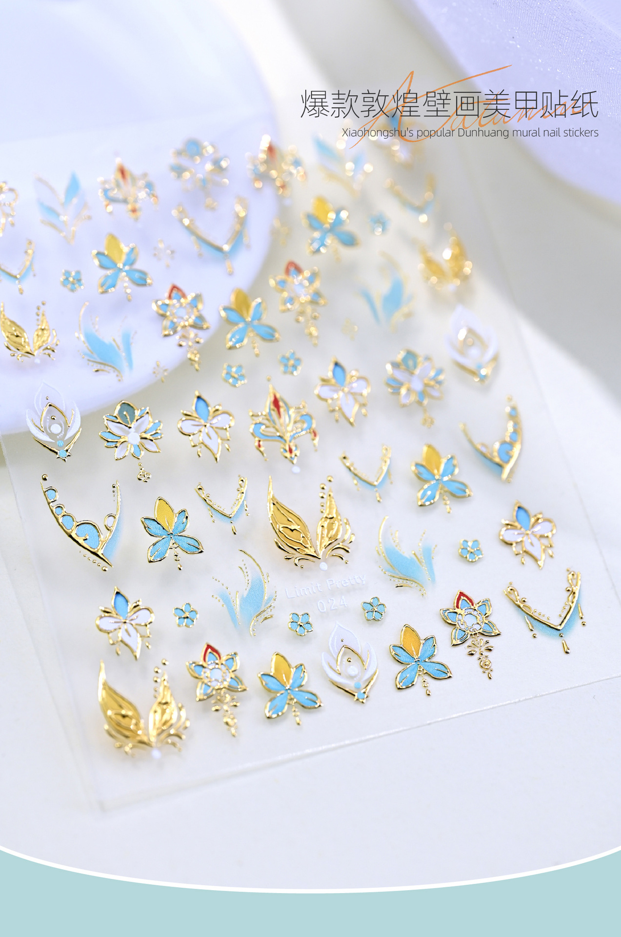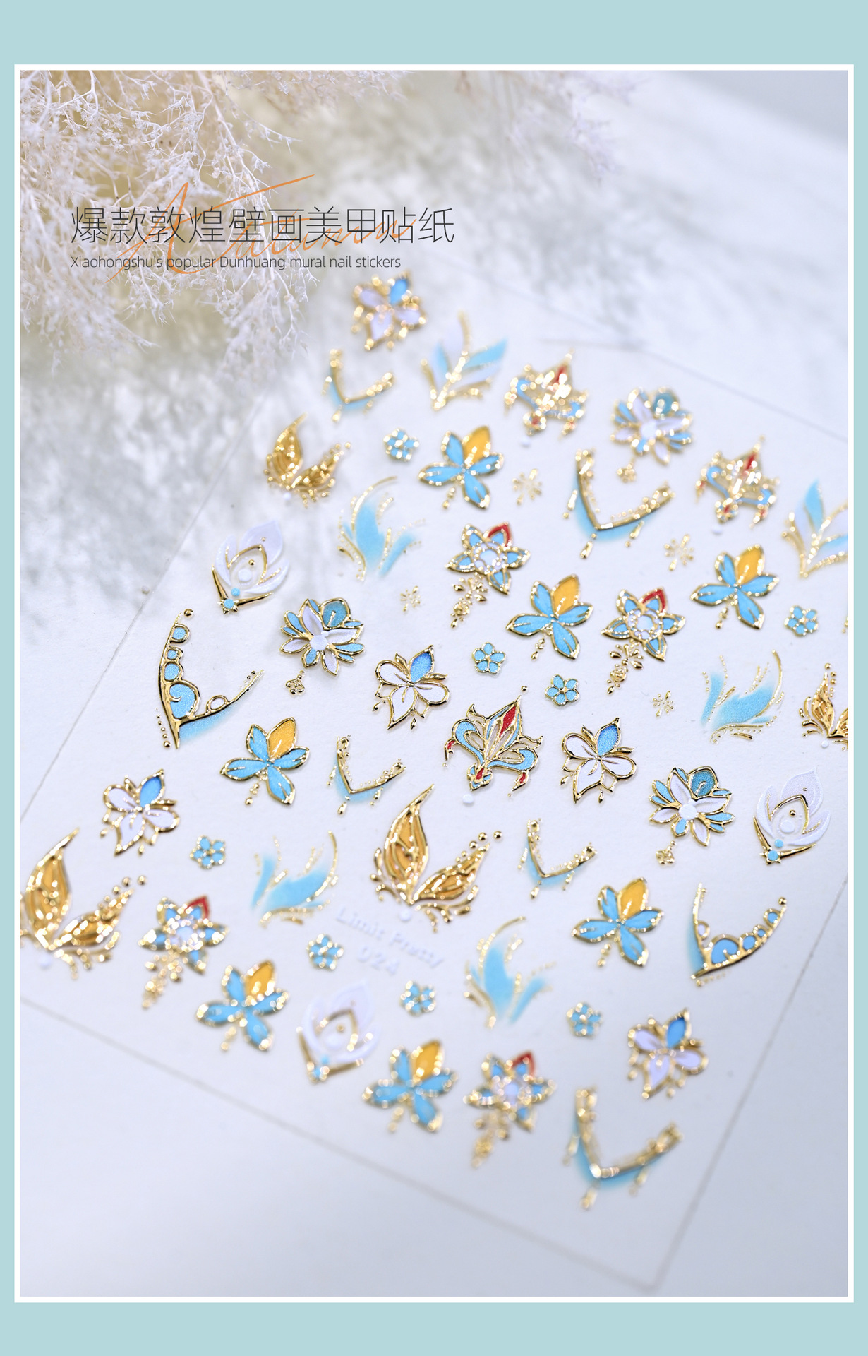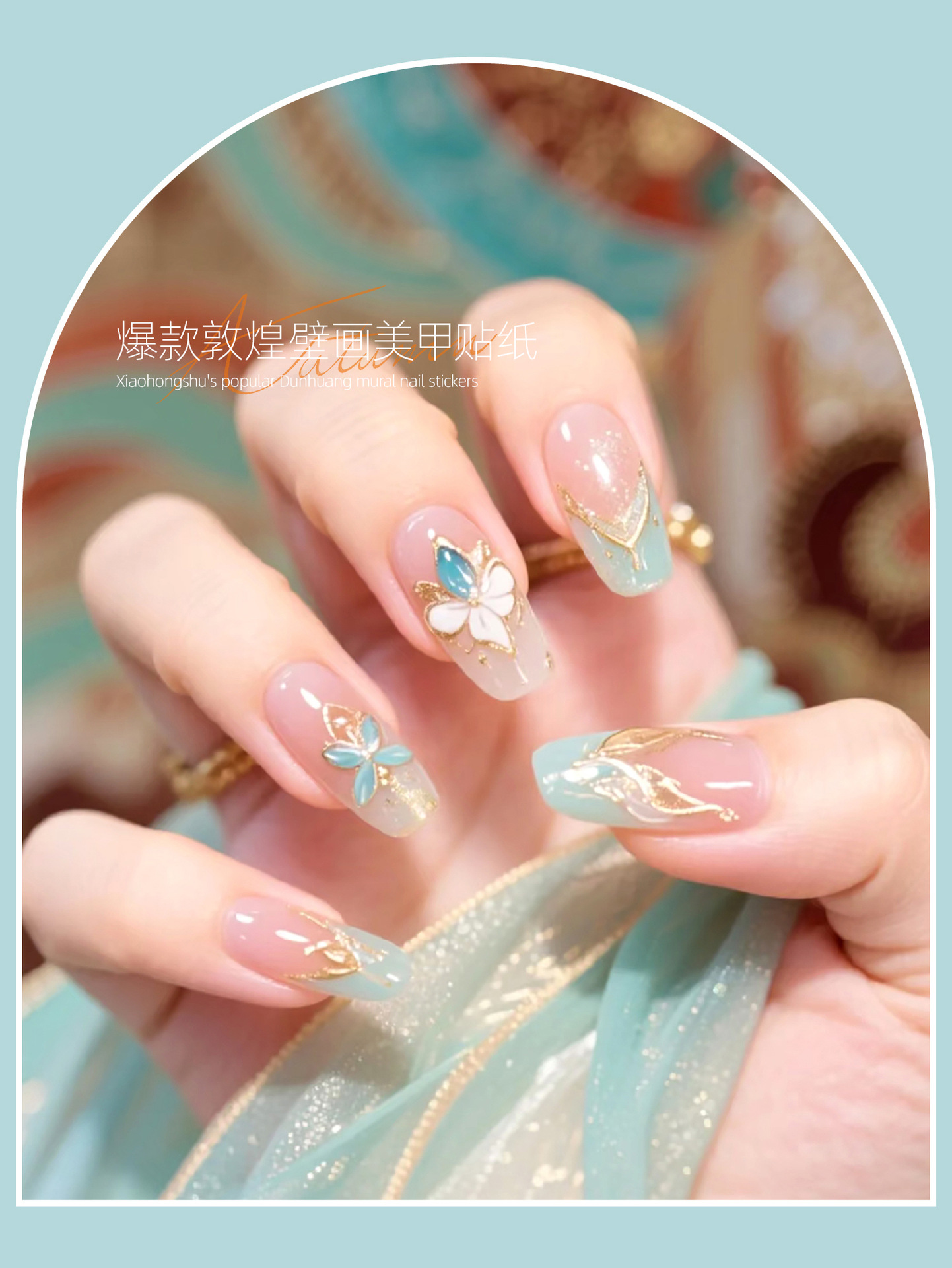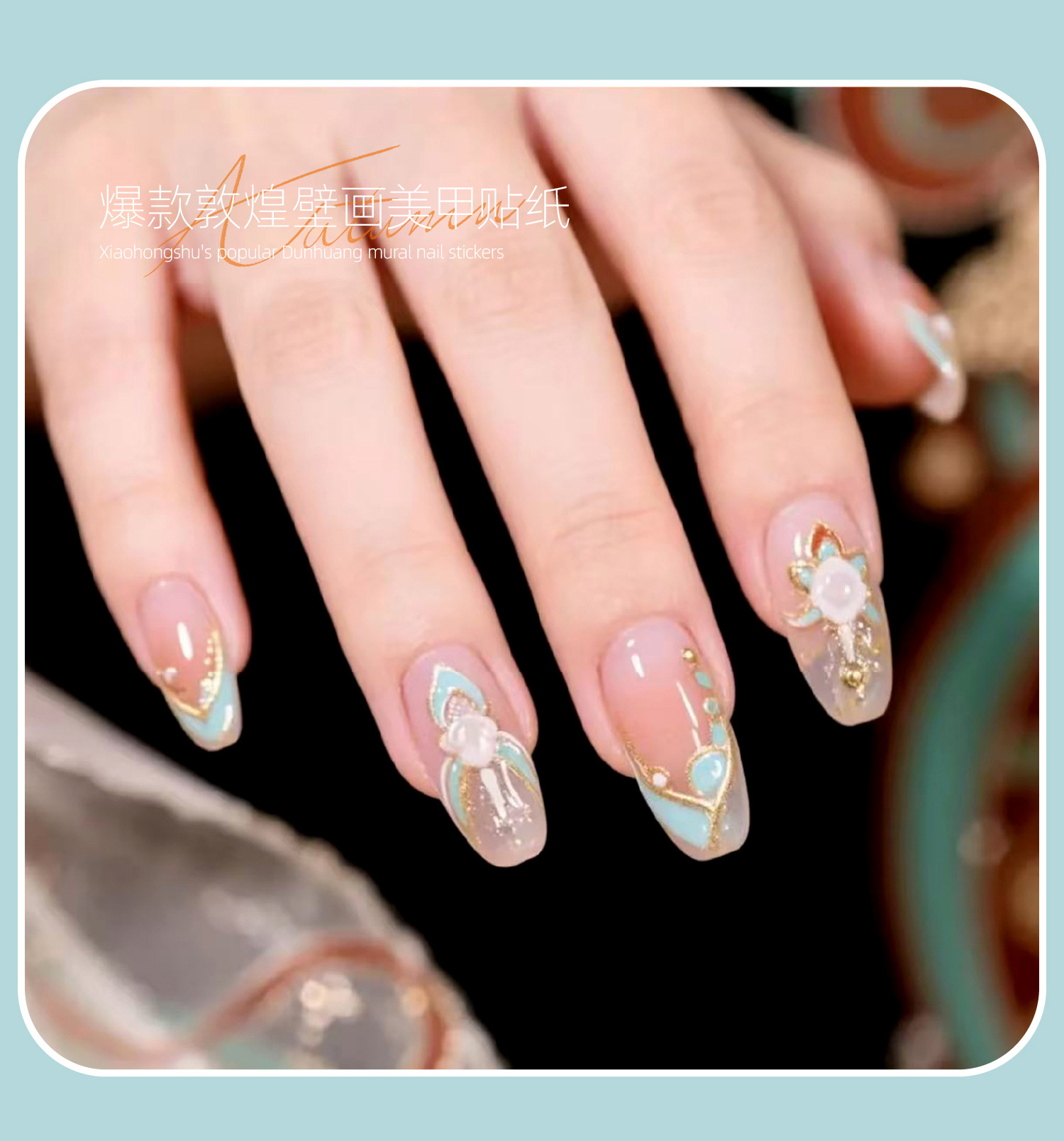 Nuevo estilo chino, elegante mural de Dunhuang, pegatinas de uñas, flores francesas en relieve, pegatinas de uñas de vestir tridimensionales al por mayor