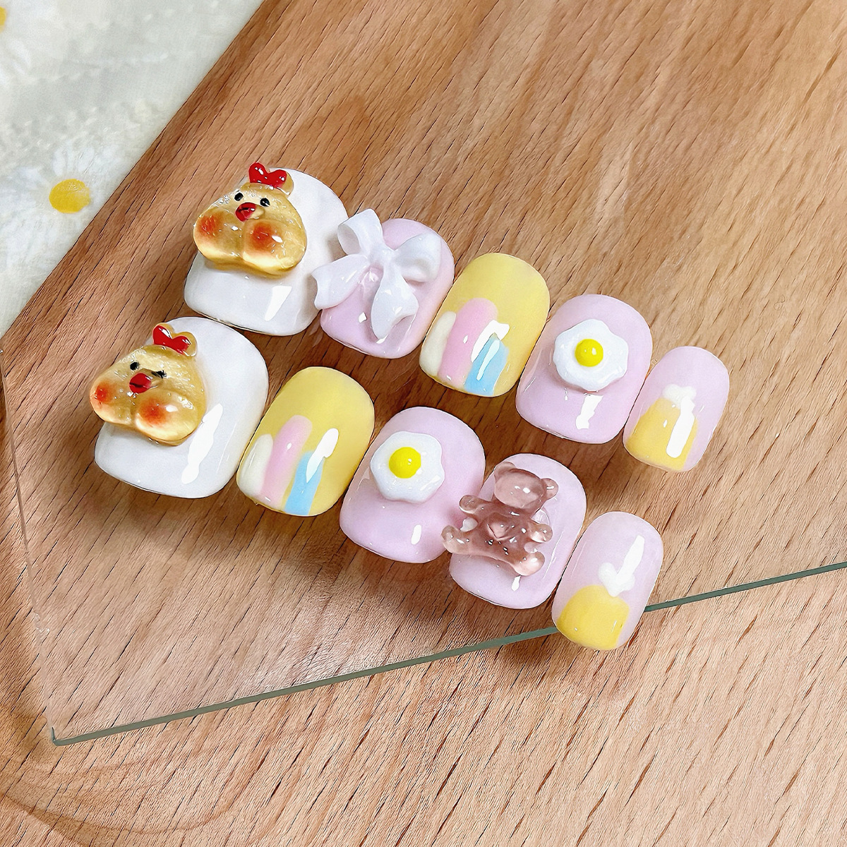 Pura hecha a mano, dibujos animados en espera, dopamina tridimensional, pollo lindo, huevo escalfado, manicura, uñas, uñas postizas, uñas