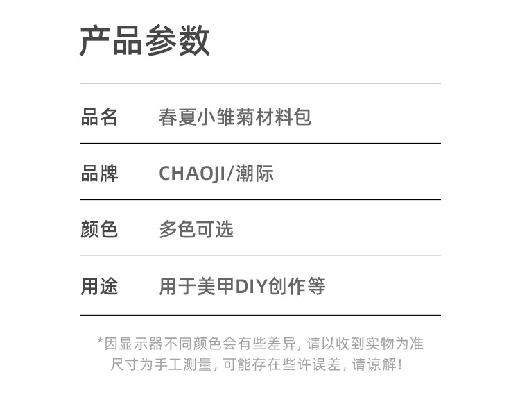 | Especificaciones | Paquete de material de margarita de primavera y verano rosa,Paquete de material de margarita de primavera y verano púrpura,Paquete de material de margarita de primavera y verano azul,Paquete de material de margarita de primavera y verano dorado,Paquete de material de margarita de primavera y verano verde |