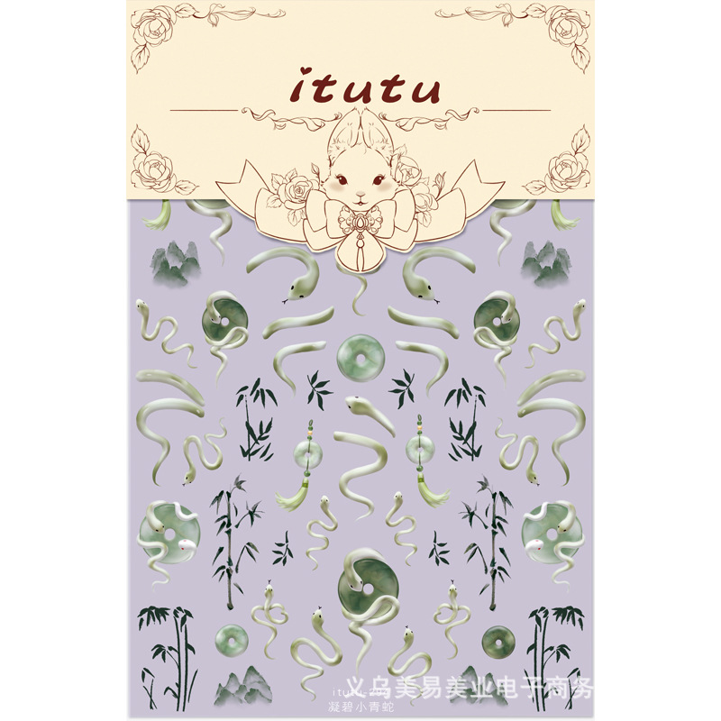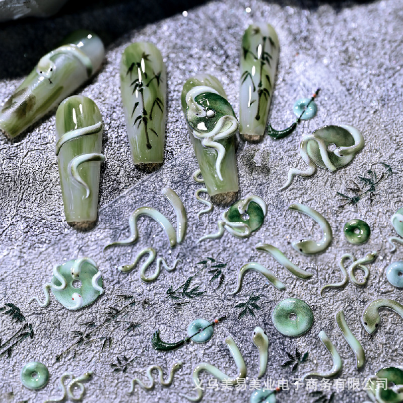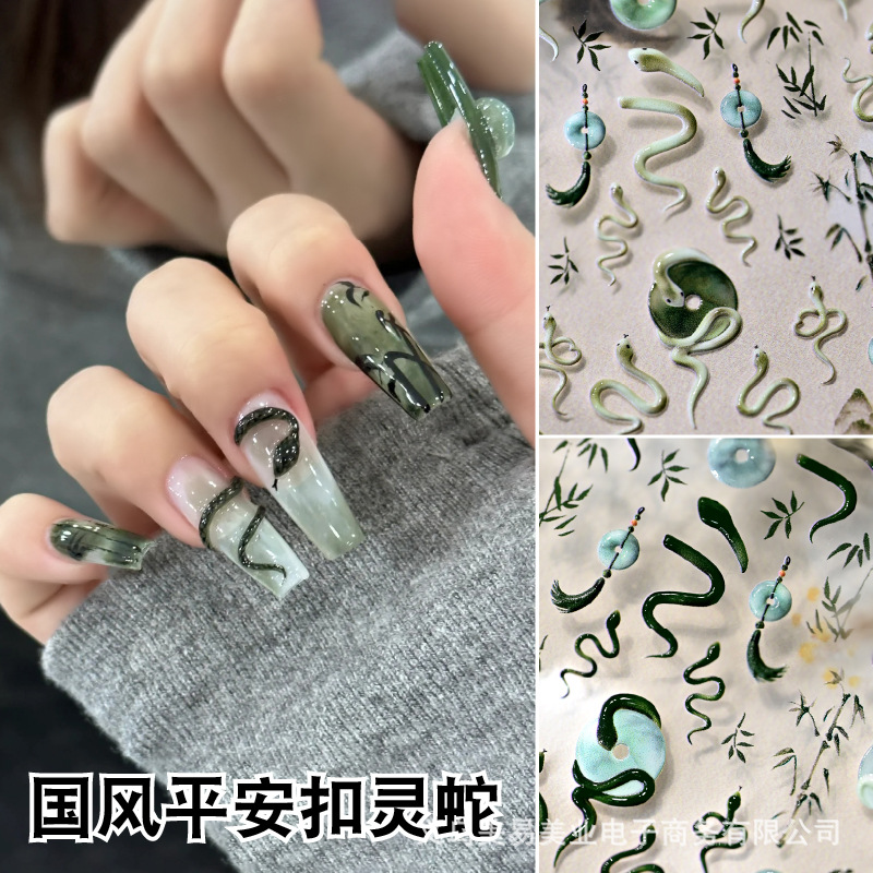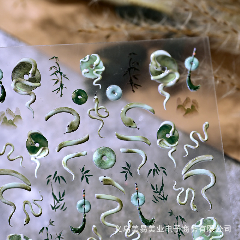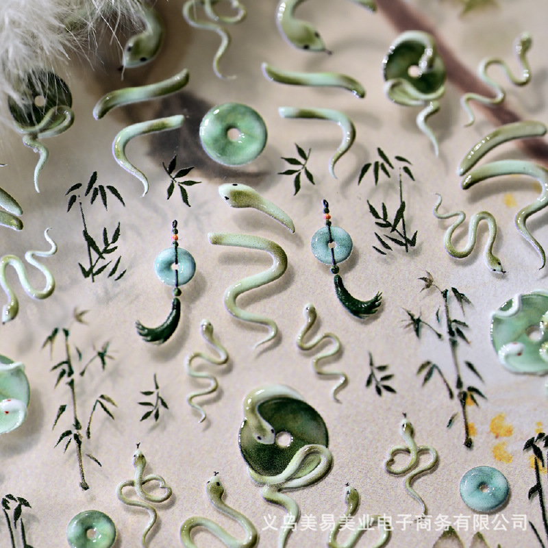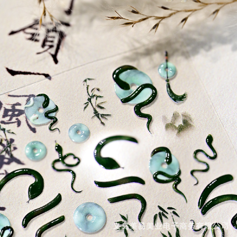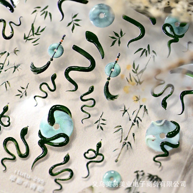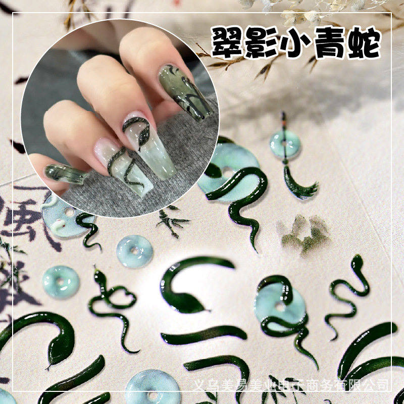 Nuevo estilo nacional Ping An Snake en relieve Snake Year pegatinas de uñas pequeñas serpientes azules tinta bambú pegatinas de jade