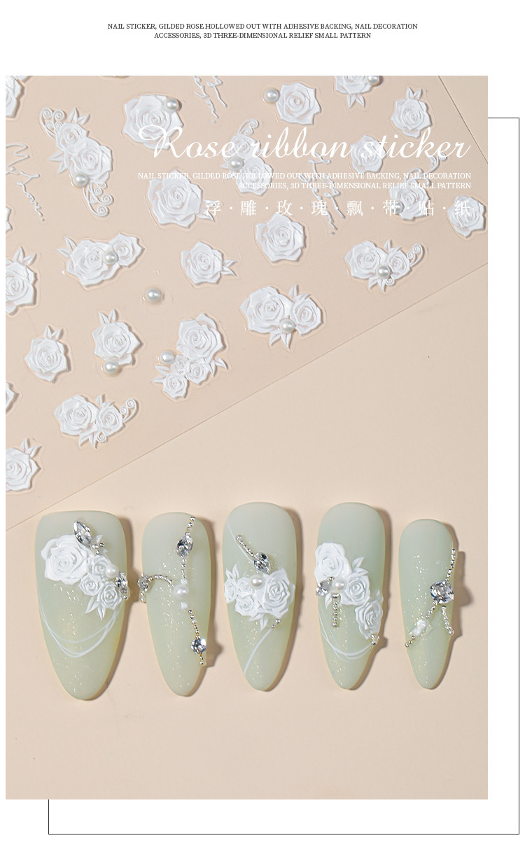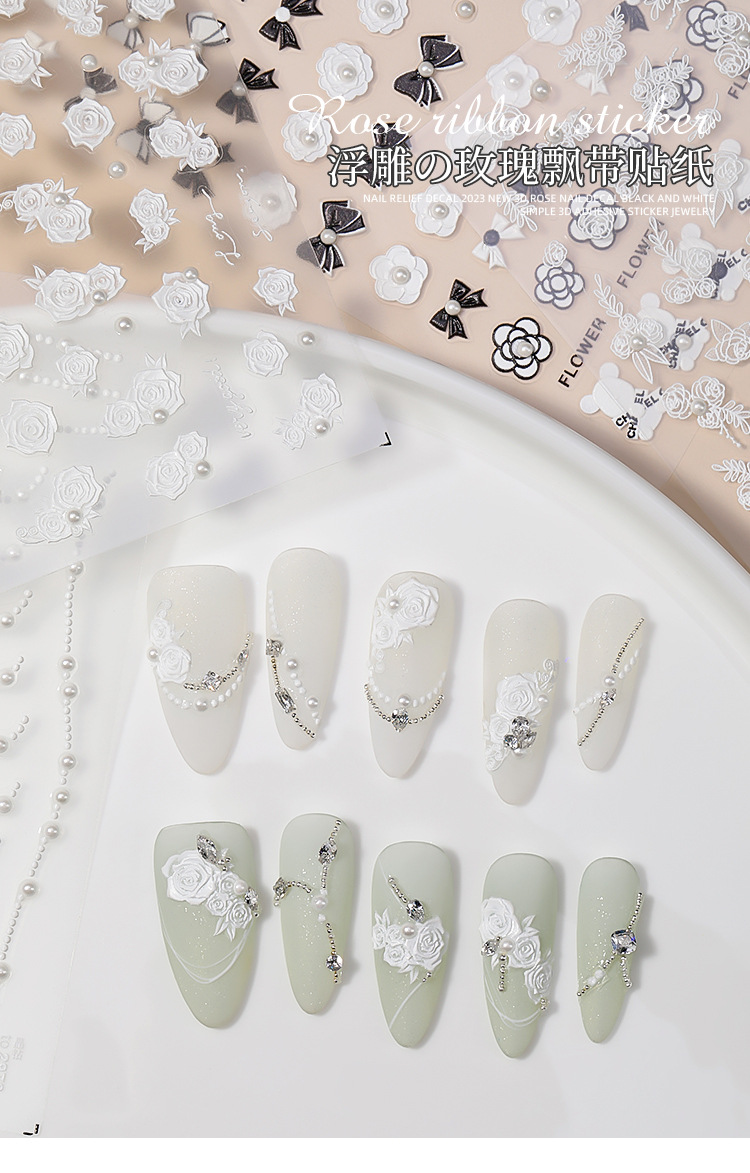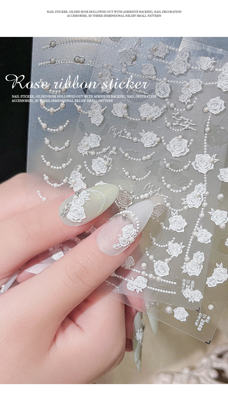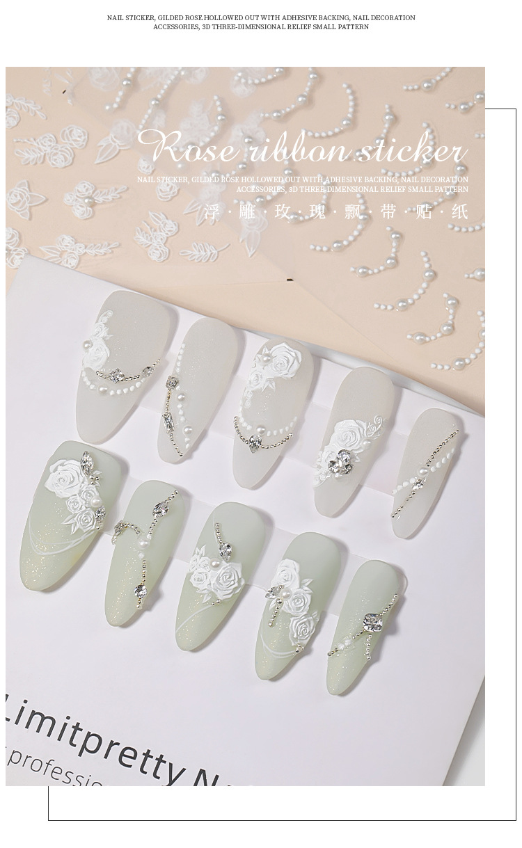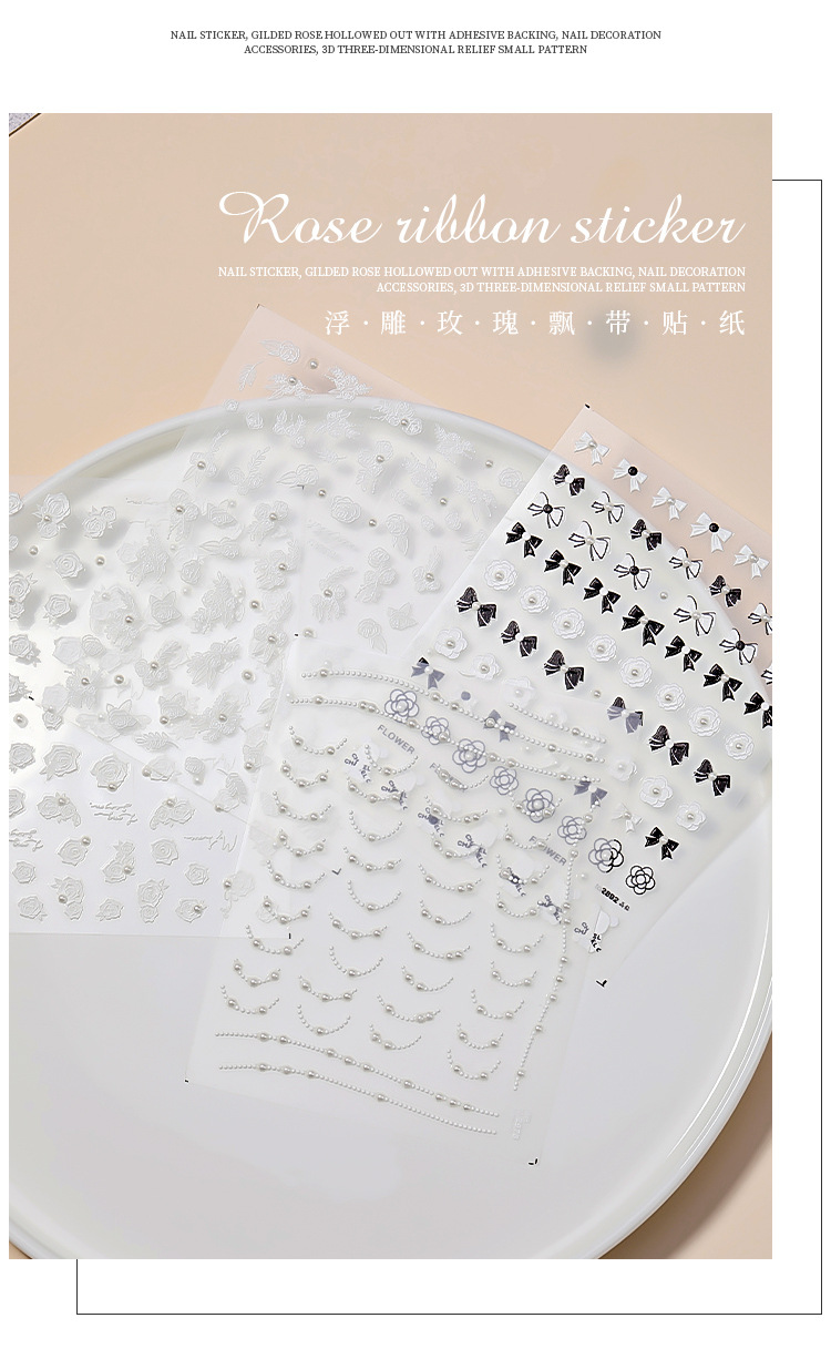 Pegatinas en relieve para decoración de uñas estilo francés con diseño de rosa y perla, novedad, adhesivas, con lazo, venta al por mayor