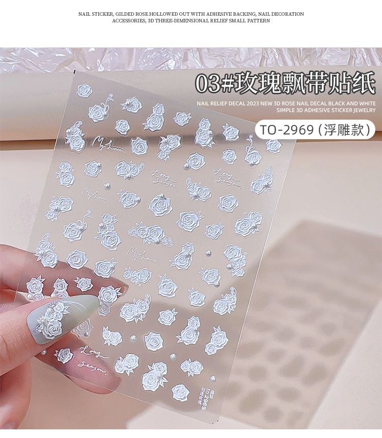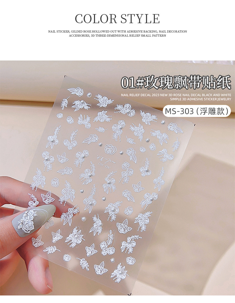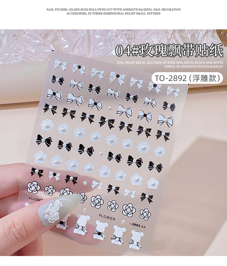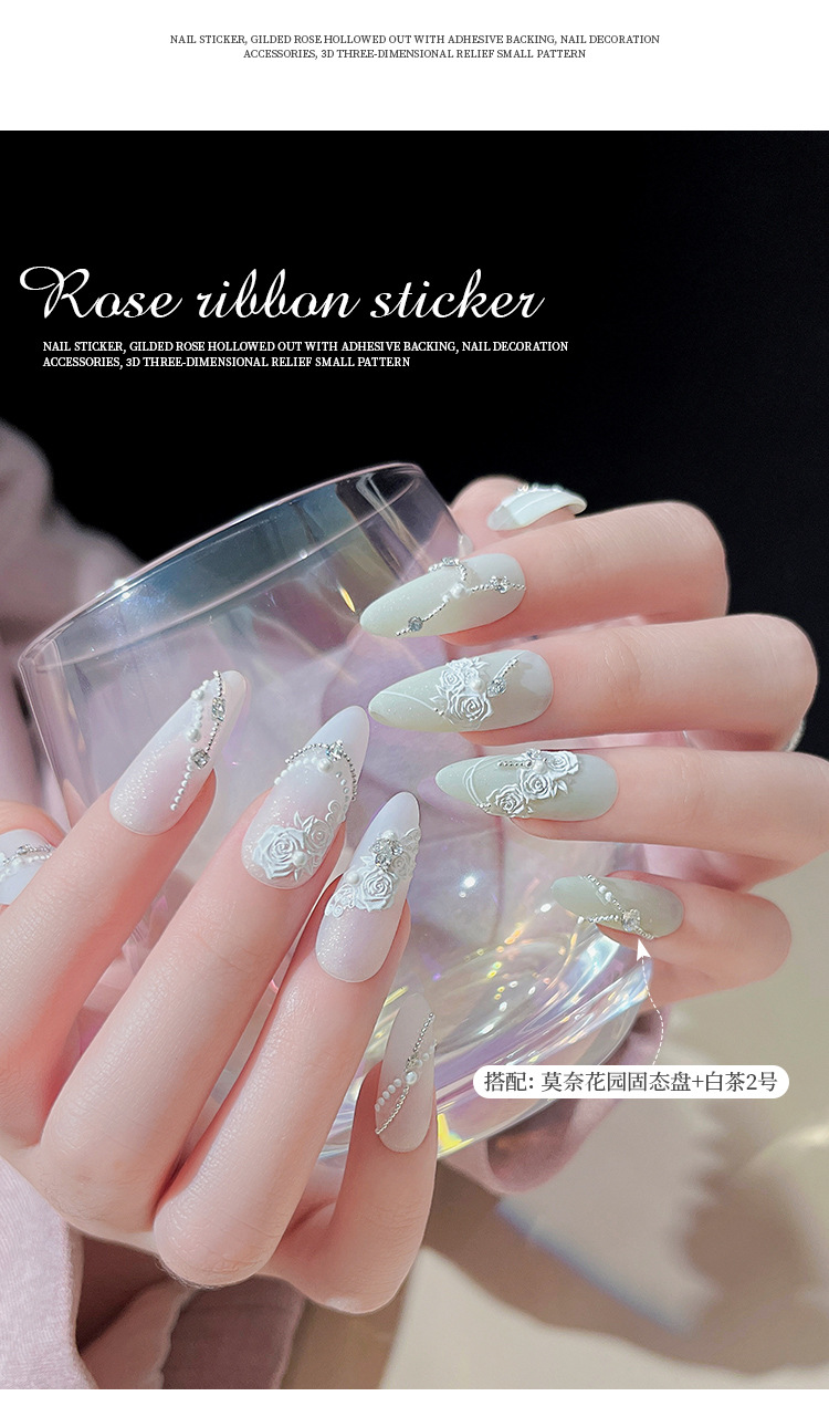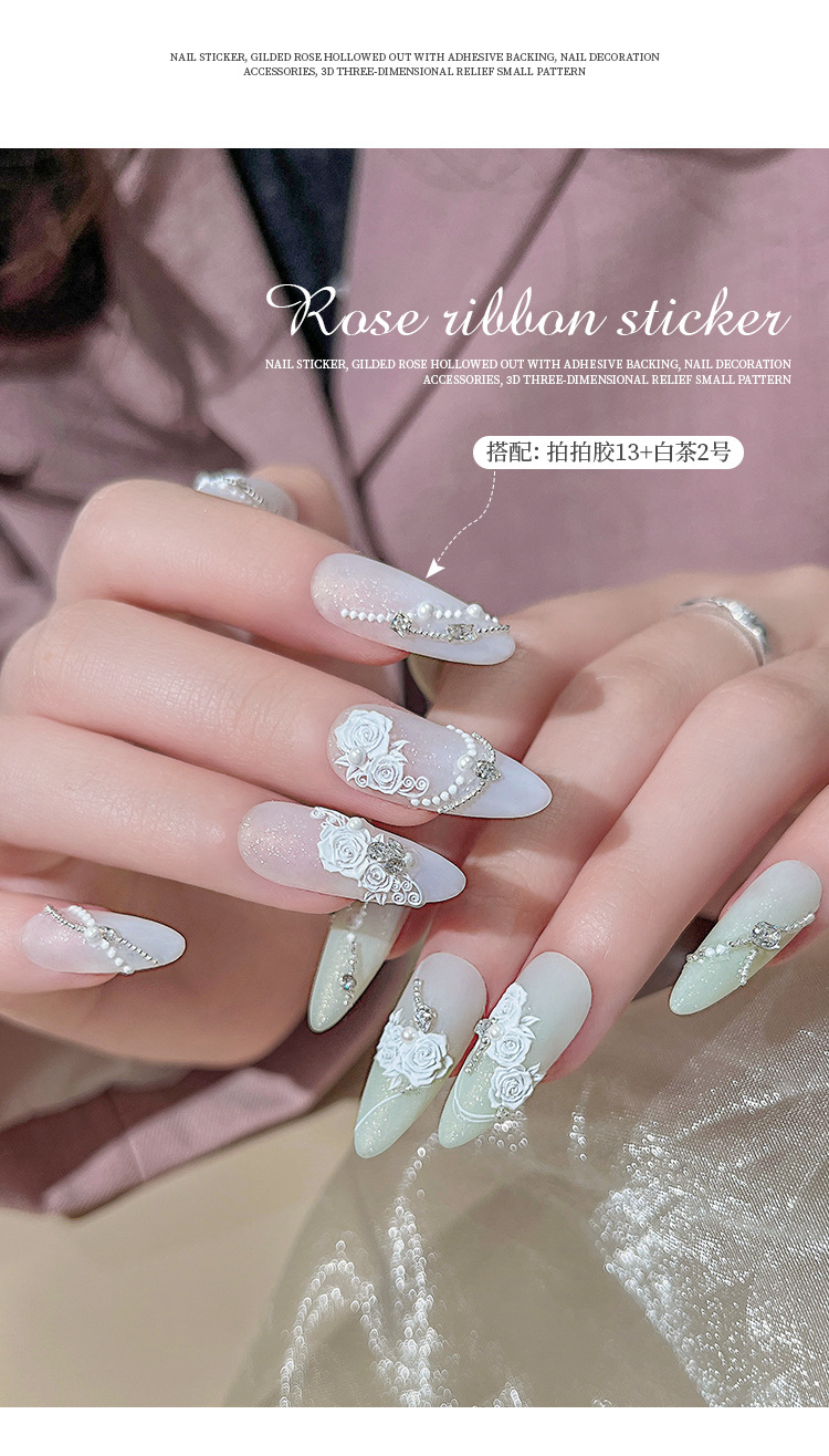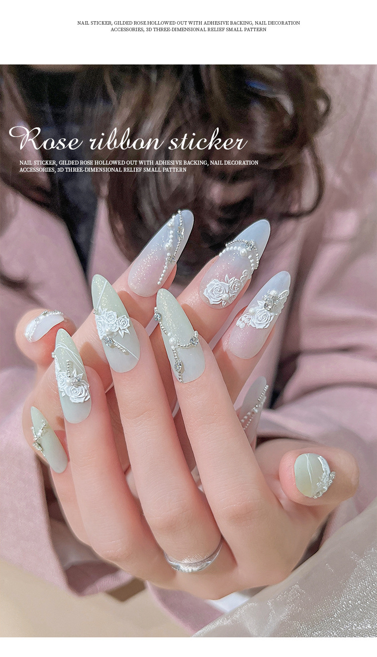 Pegatinas en relieve para decoración de uñas estilo francés con diseño de rosa y perla, novedad, adhesivas, con lazo, venta al por mayor