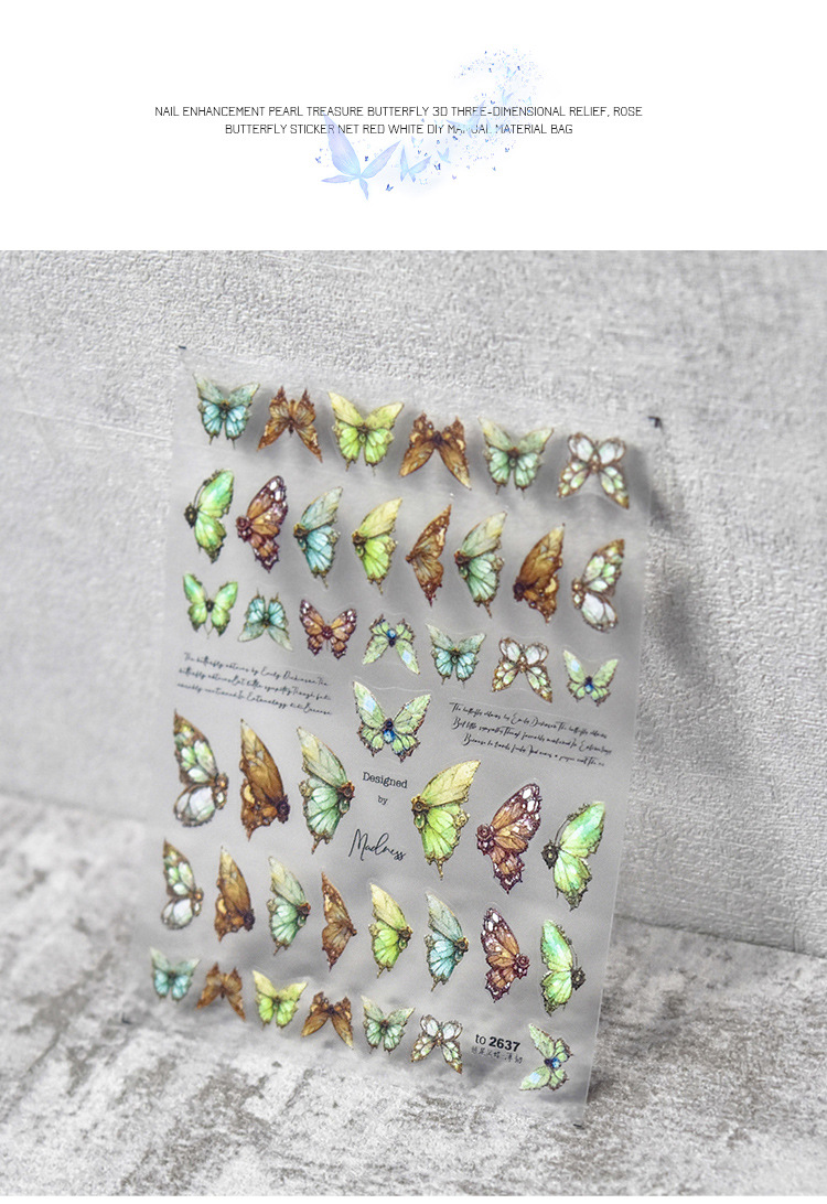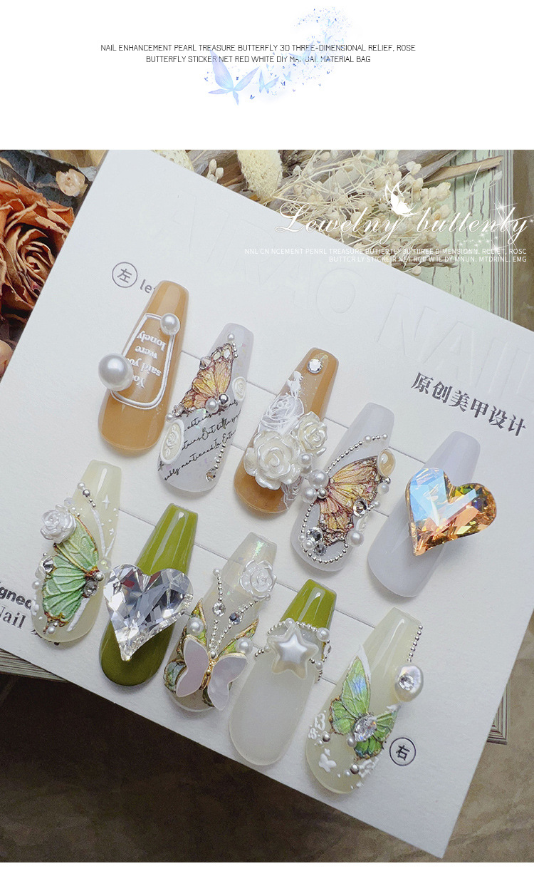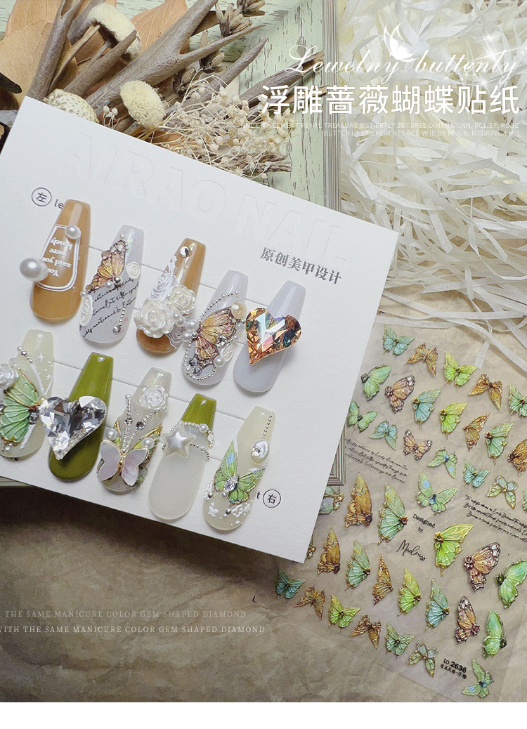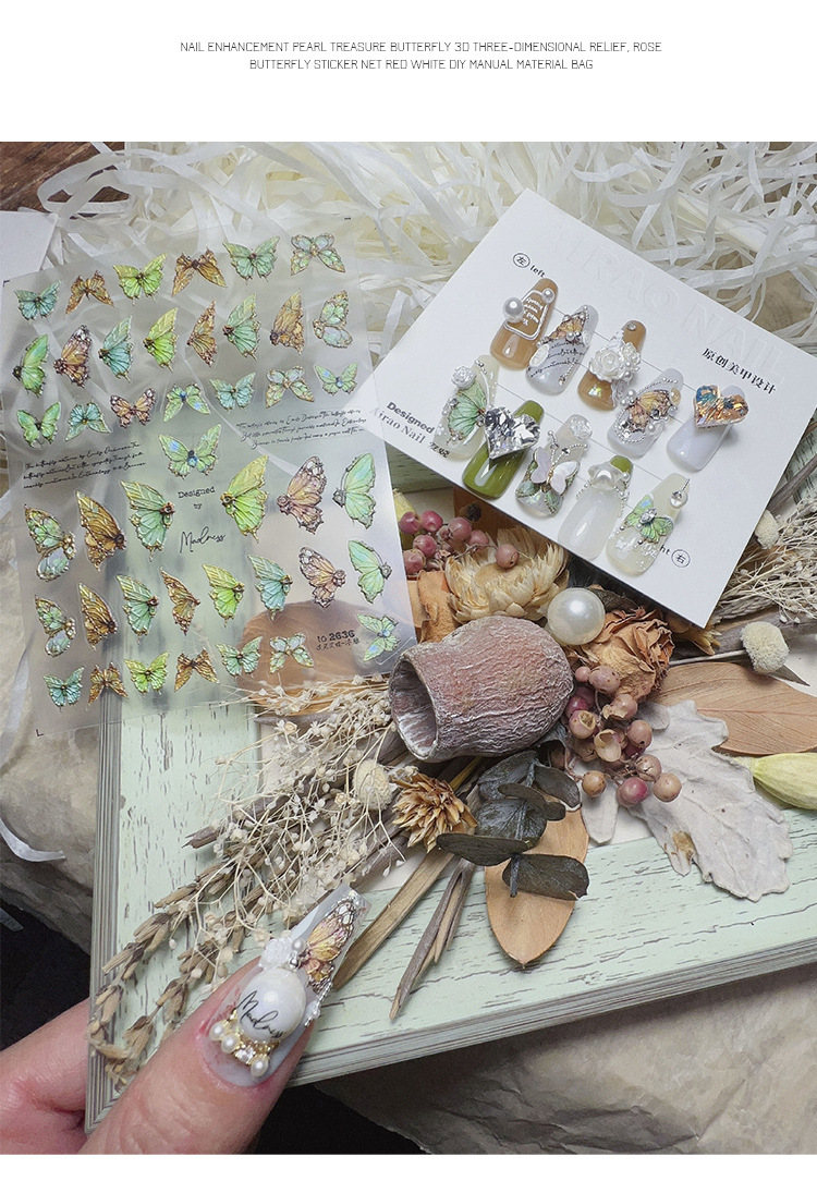 Uñas belleza perla mariposa 3D tridimensional alivio Rosa mariposa pegatinas blanco verde pies Fénix mariposa decoraciones al por mayor