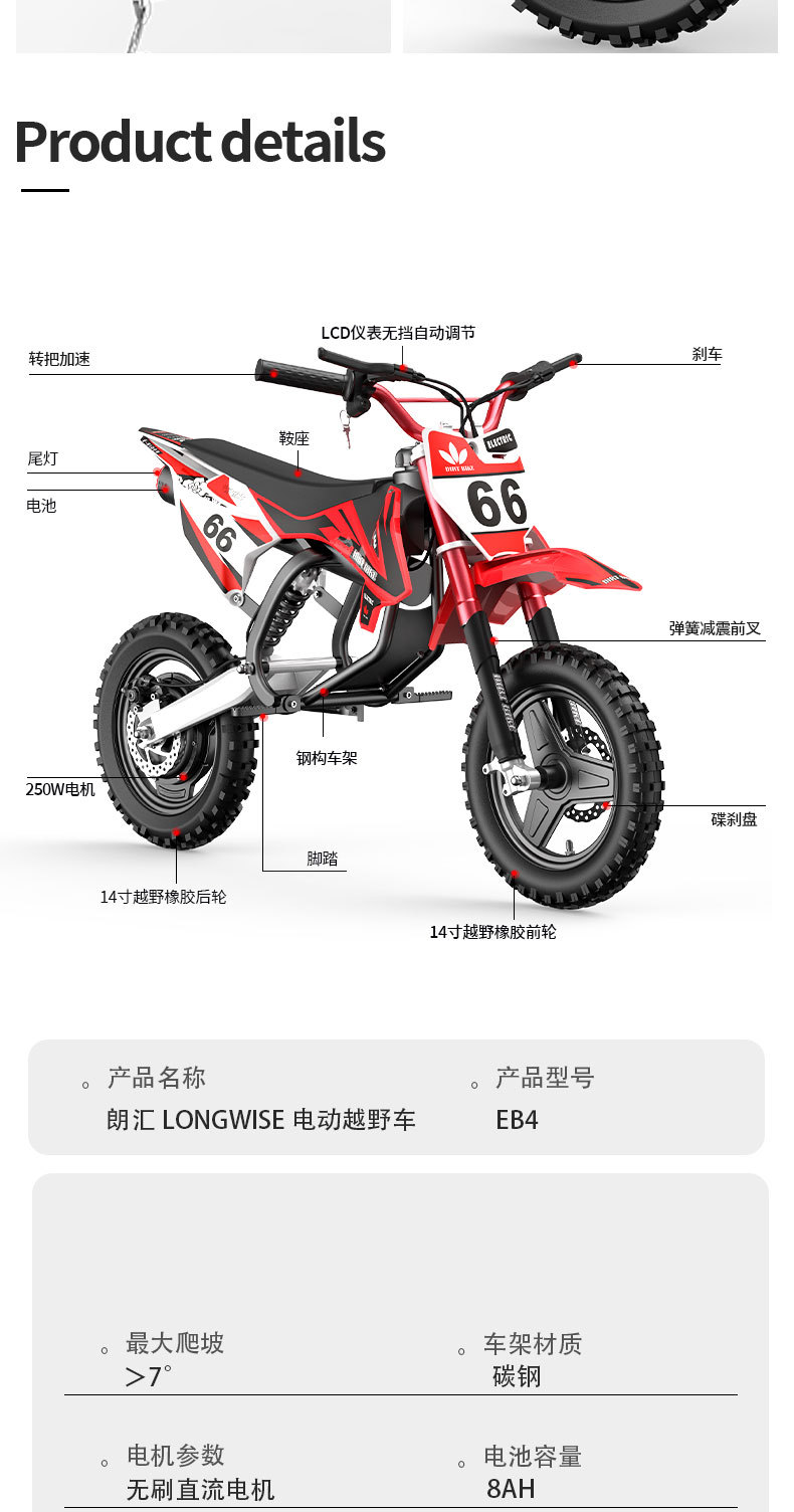 | Color | Rojo / eb4 coche desnudo / sin batería, naranja / eb4 / 36v8ah / autonomía 25 km, rojo / eb4 / 36v8ah / autonomía 25 km, azul / eb4 / 36v8ah / autonomía 25 km, verde / eb4 / 36v8ah / autonomía 25 km / h, blanco / eb4 / 36v8ah / autonomía 25 km |