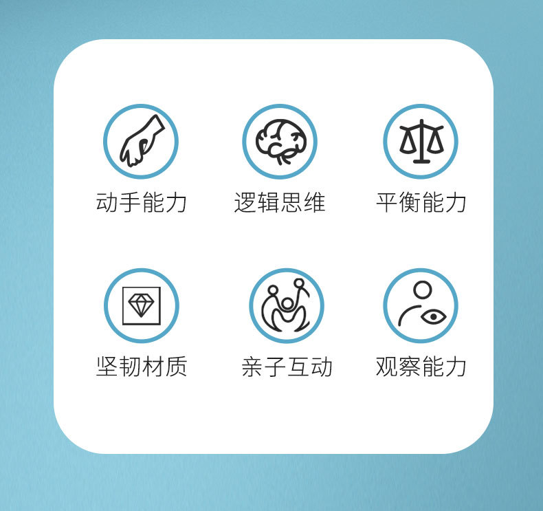 | Entrenamiento de habilidades | Emoción,Visión,Desarrollo intelectual,Manos y cerebro,Agarre,Los sentidos,Coordinación mano-ojo,Juguetes interactivos,Comunicación entre padres e hijos |