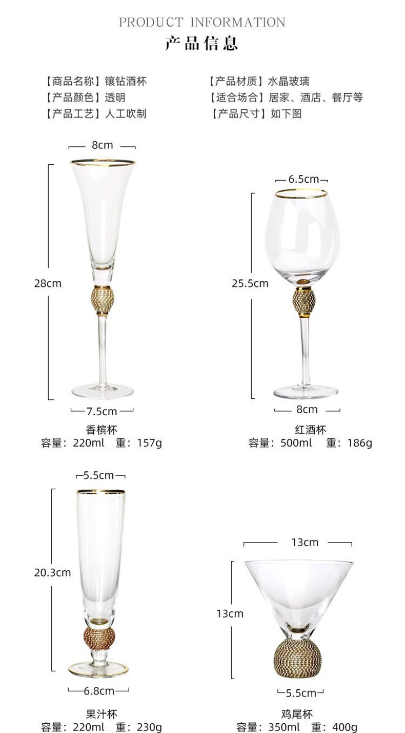 | Color | Copa de vino tinto con diamante dorado, Copa de champán con diamante dorado, Copa de cóctel con diamante dorado, Copa de vino tinto con diamante plateado, Copa de champán con diamante plateado, Copa de cóctel con diamante plateado |
