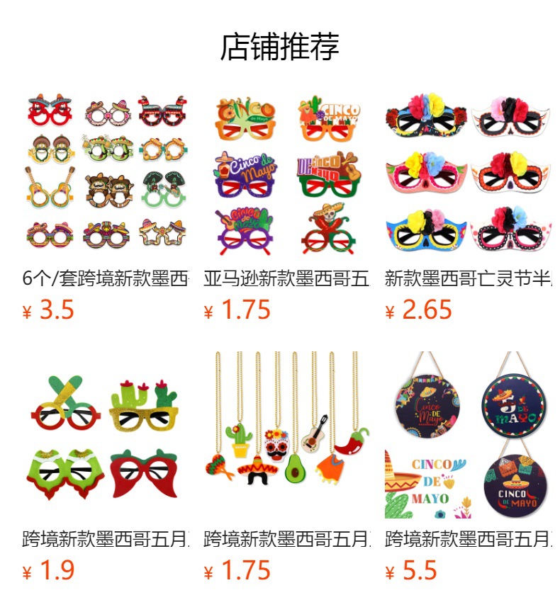 | Colores | Chal mexicano,Sombrero de paja aguacate,Calavera pintada,Sombrero de paja y barba,Sombrero de ala ancha,Sándwich mexicano,Sombrero de ala ancha de chile,Calavera de dalia,Calavera de flor azul,Piñata |