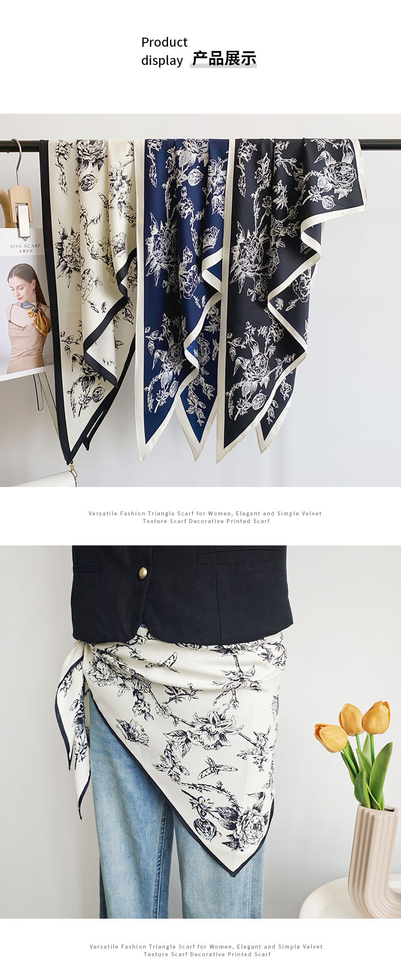 | Estilo | Versátil, elegante, elegante OL, simple, europeo y americano, lujo ligero, estilo chic, sentido de alto nivel Bufanda triangular |
