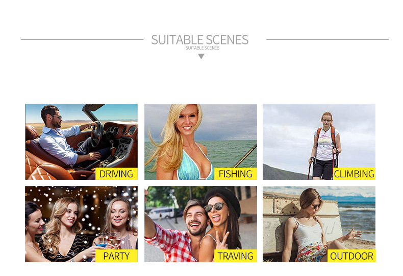 | Escenarios aplicables | Protección solar, pesca, viajes, deportes al aire libre, ciclismo, moda, conducción, espectáculos escénicos, fiestas |
