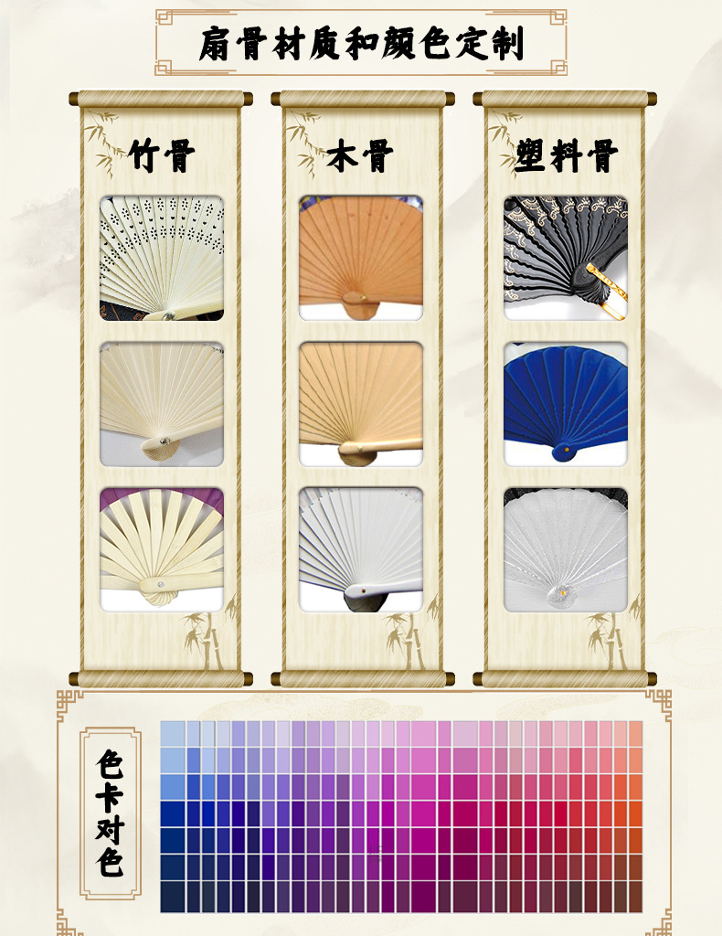 【扇面颜色】大红色、黑色、浅蓝色、紫色、白色、浅粉色、深粉色、玫红色、宝蓝色(扇袋同款哦)