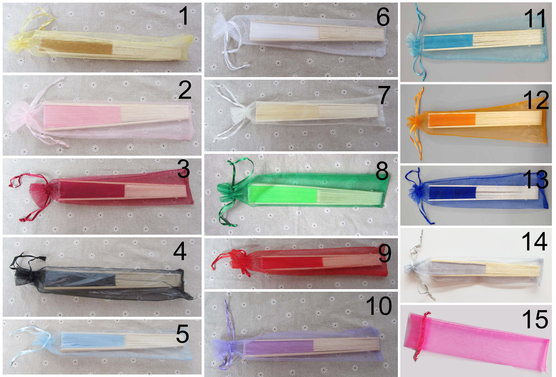 现货仅有15个颜色。可以装21cm-23cm的小扇子